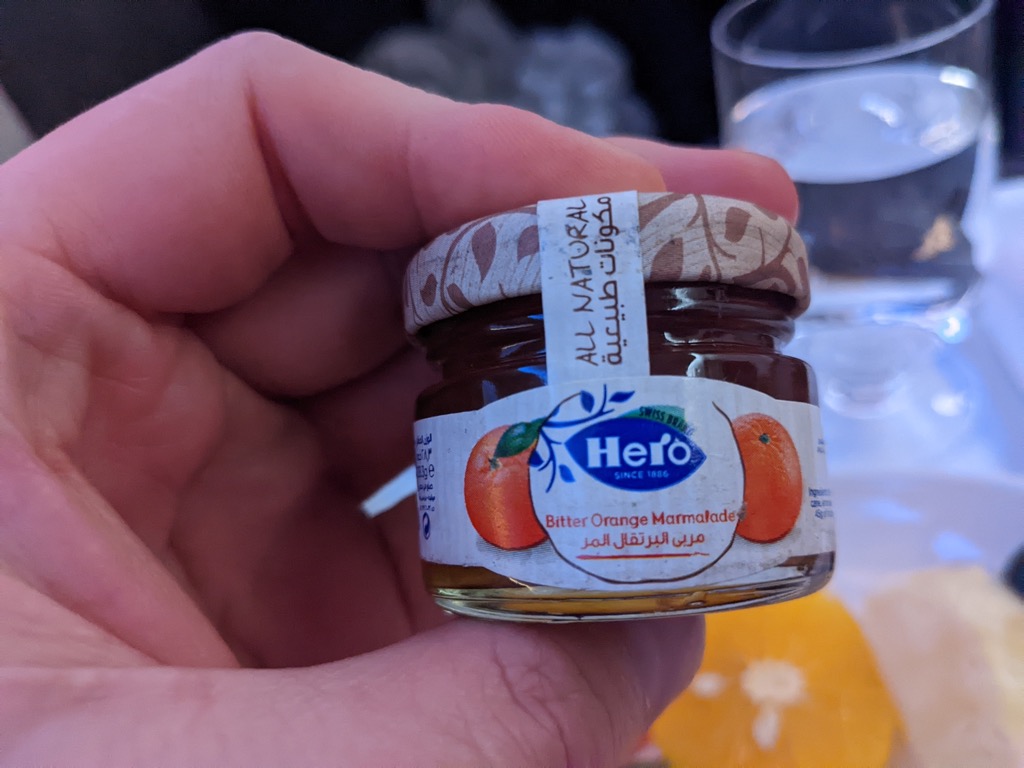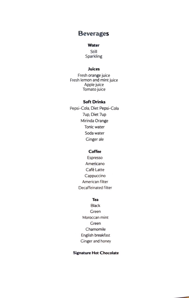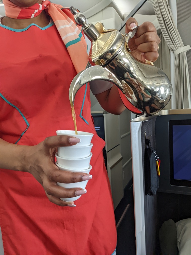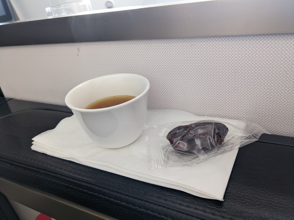 Als wir am Gate angekommen sind, hatte das Boarding bereits begonnen. Das war jedoch kein Problem, denn wir wurden als Business Class Passagier durch die Menschenansammlung eskortiert. Im Flugzeug haben wir ein Welcome-Getränk, so wie wahlweise ein Hot- oder Cold-Towel erhalten. Ergänzend dazu wurde ein arabischer Kaffee und eine Dattel serviert und ein Crew-Mitglied fragte uns nach unseren Wünschen für das Essen. Auf Flügen die nachmittags oder später starten, kann als Welcome-Getränk auch Alkohol bestellt werden. Von Anfang bis Ende war die Crew stets freundlich und am Ende unseres Fluges gab es noch ein Abschiedsfoto mit der Crew.