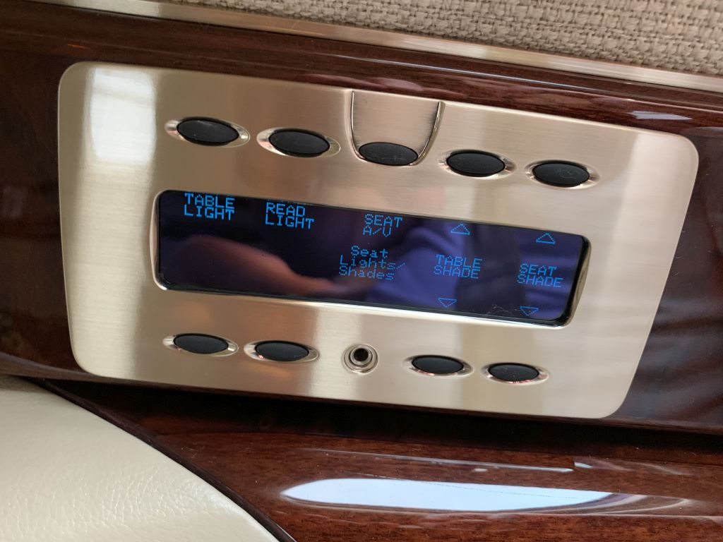 Zwischen jedem Sitzpaar kann ein doch recht großer Tisch ausgeklappt werden. Getränke können neben jedem Sitz in zwei Getränkehalter, die in die Verkleidung eingelassen sind, deponiert werden. In einem Seitenpanel eingelassen ist auch ein Bedienfeld zur Steuerung des Lichts über dem Tisch und der eigenen Leseleuchte. Über dieses Bedienfeld könnt ihr ebenfalls die Fenster verdunkeln.