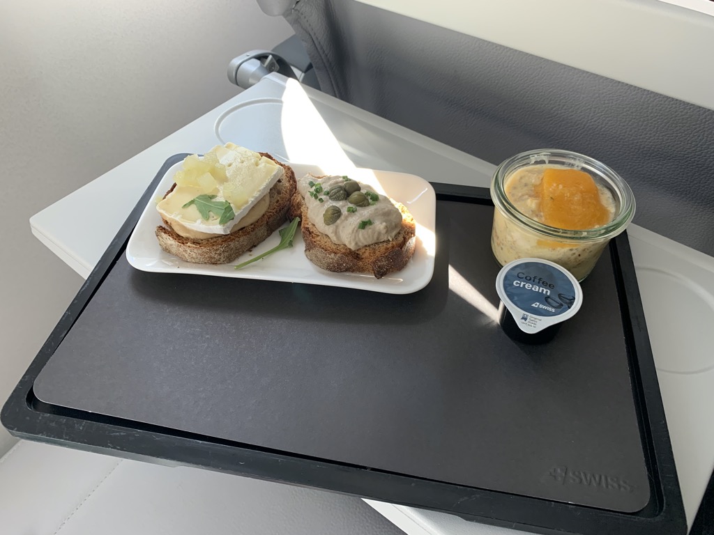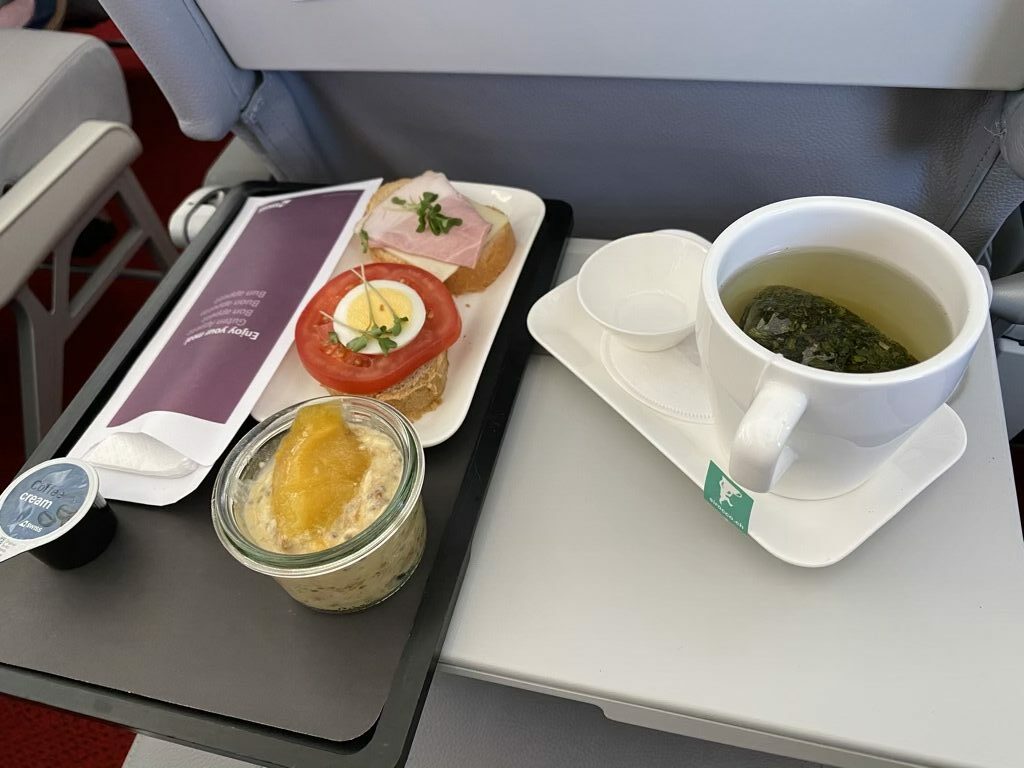 Wir hoben pünktlich ab und kurz nachdem die Anschnallzeichen erloschen waren, begann die Crew bereits mit dem Service. Jeder Business Class Gast bekam ein vorgerichtetes Tablett mit einem kleinen Snack. Da ich das angebotene Essen nicht essen durfte (von einigen Dingen, wie Camembert, wird einer Schwangeren abgeraten), bot man mir direkt eine Alternative an, die ich für den Test gerne annahm. Es wäre auch kein Problem gewesen auf dem kurzen Flug nichts zu essen.