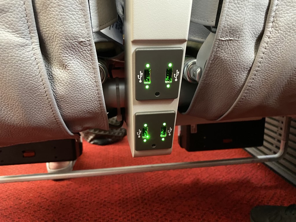 Wir fanden, dass der Sitz für einen Kurzstreckenflug eine angenehme Polsterung aufweist und auch optisch etwas hermacht. Besonders gefreut haben uns die USB Anschlüsse, welche an jedem Platz verbaut sind. Hier kann man während des Fluges seine elektronischen Geräte laden. Jeder Sitz verfügte hier gleich über zwei Anschlüsse!