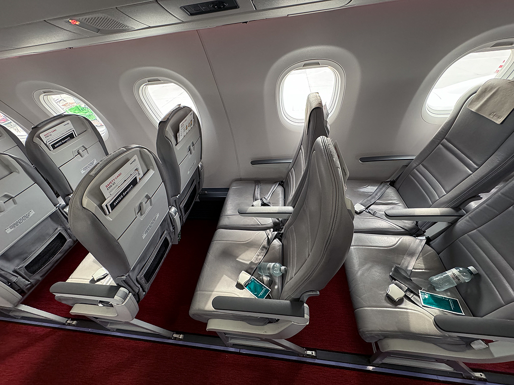 Die Helvetic Embraer 195-E2 haben 134 Sitzplätze in 2-2 Konfiguration. Business und Economy Class lassen sich flexibel mittels eines beweglichen Vorhangs trennen. Der rote Teppich im Gang setzt sich kräftig vom ansonsten grau/beigen Interieur ab. An dem Kopfteil der Sitze (für viele normalgroße Europäer ist das eher eine Schulterstütze) hatten einige Sitze ein Leder hängen, die meisten jedoch nicht. Das machte keinen guten Eindruck auf mich.