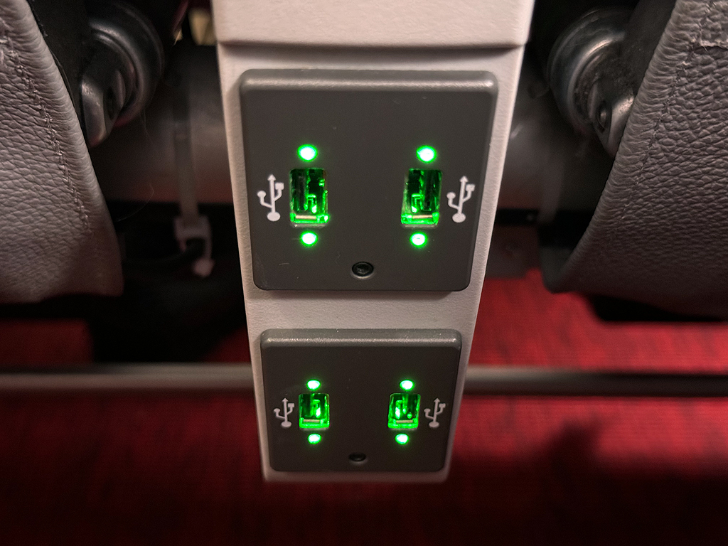 Wer elektrische Geräte laden möchte, findet jeweils vier USB-A Buchsen für zwei Sitzplätze vor. Leider gibt es keine USB-C Buchsen, so dass Reisende hier ggf. einen Adapter einpacken sollten.