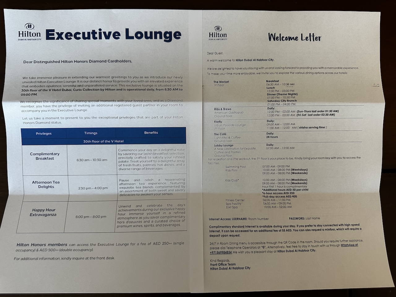 Zusätzlich dazu hängte mir der Mann noch einen Willkommensbrief mit den Informationen zur Executive Lounge aus. Diese kannte ich bereits, das Hilton nutzt die Räumlichkeit, die sich im V-Hotel befindet.