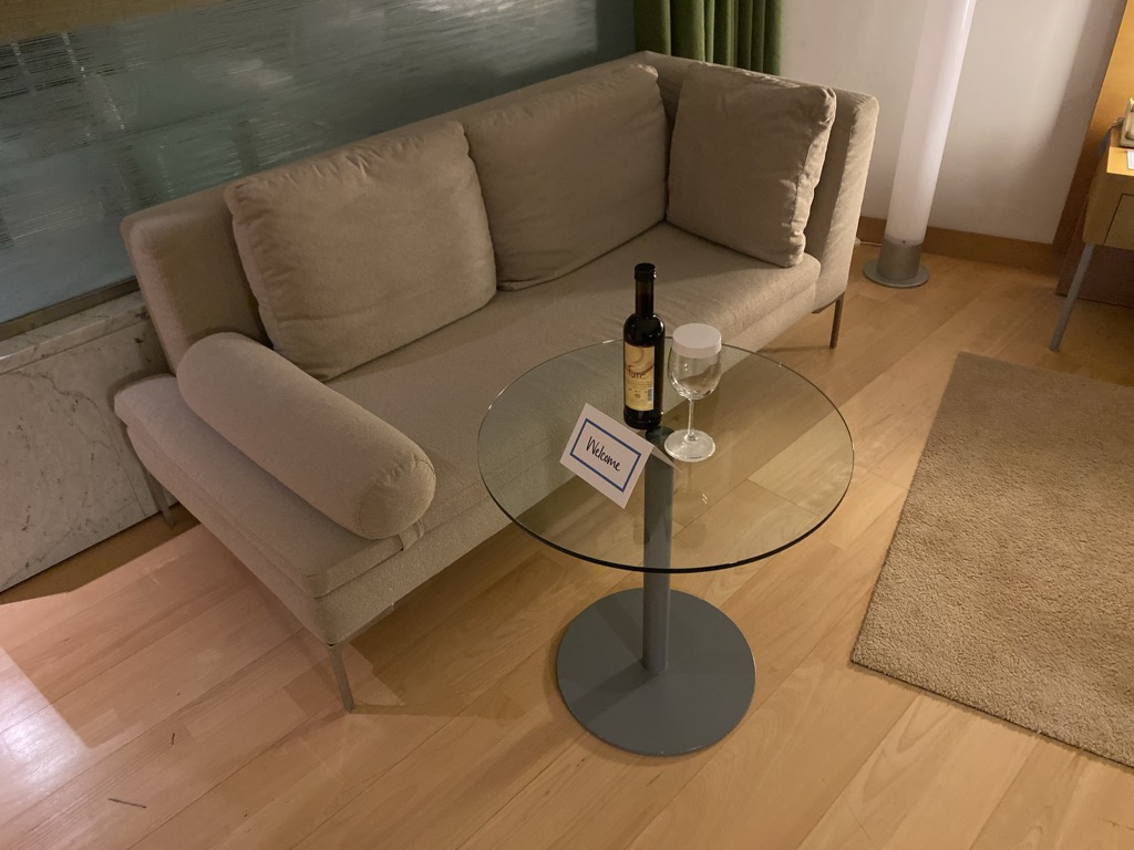 Neben dem Bett stand eine kleine Couch inklusive Tisch, auf dem uns griechischer Wein begrüßte. Wären wir nicht hundemüde direkt ins Bett gefallen, hätten wir uns sicher ein Gläschen gegönnt.