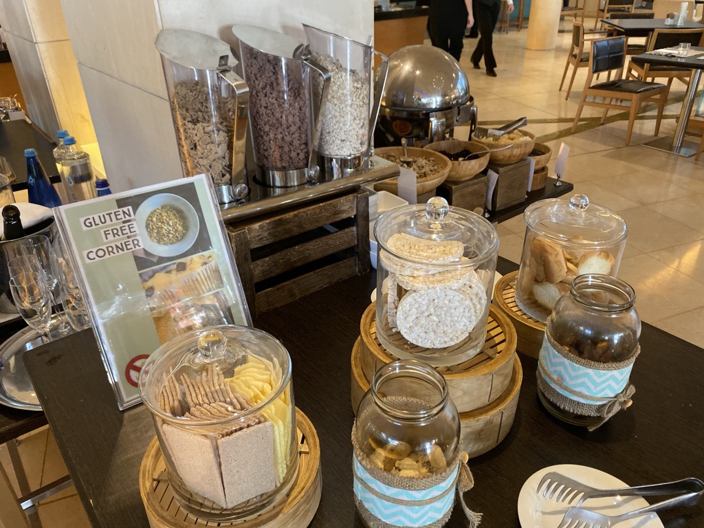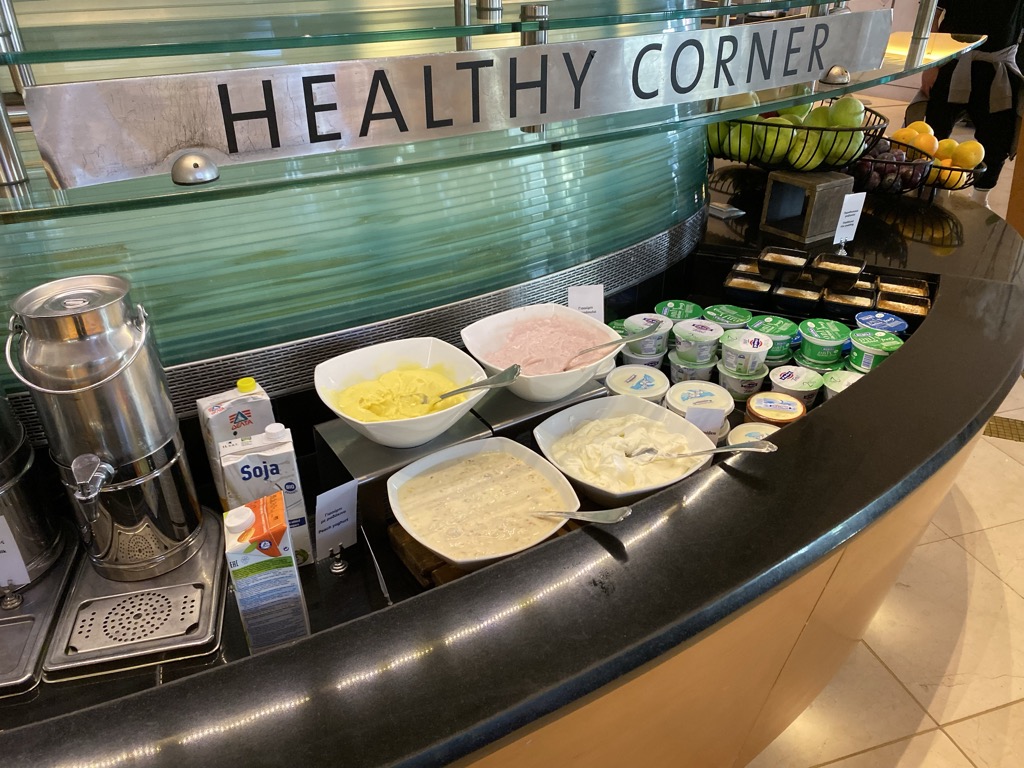 An einem großen Buffet gab es zudem Obst, Aufschnitt, Salat, verschiedene Backwaren, Müsli und Joghurt. Auch einen extra Tisch mit glutunfreien Speisen gab es hier.