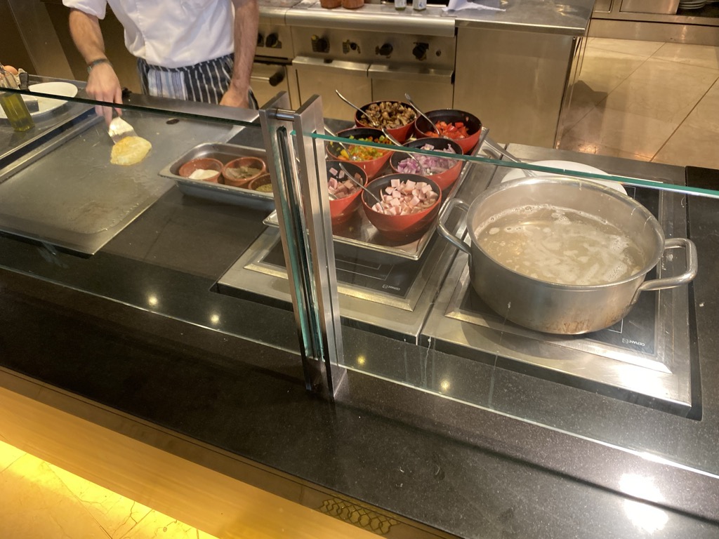 Neben diversen warmen Speisen gab es zum Beispiel eine Station für frische Eierspeisen. Hier wurde unter anderem Omelette zubereitet – für Eggs Benedict hätte man extra zahlen müssen. Trotzdem schön dass es die Option gibt, das ist nicht selbstverständlich in einem Hilton.