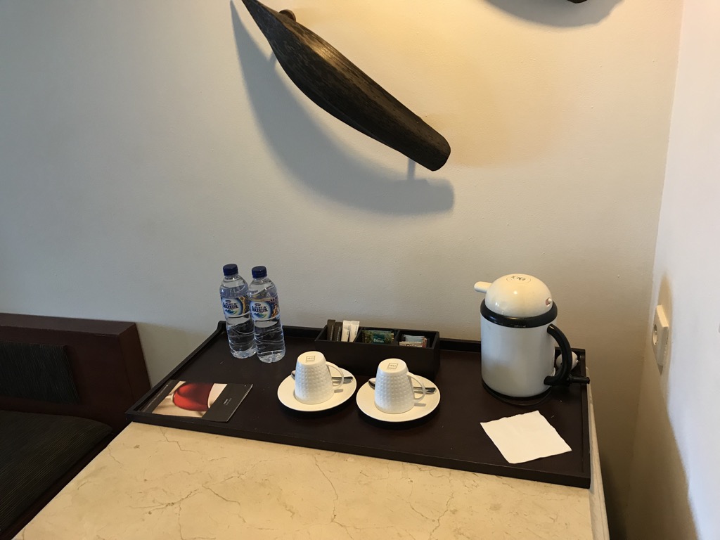 Nach dem Betreten des Zimmers befand sich auf der rechten Seite der Schrank inkl. Slipper, Regenschirm, Bademäntel und Safe. Direkt dahinter befand sich die Teestation, auf der auch frisches Wasser zu finden war. Unter der Teestation war die gefüllte Minibar.