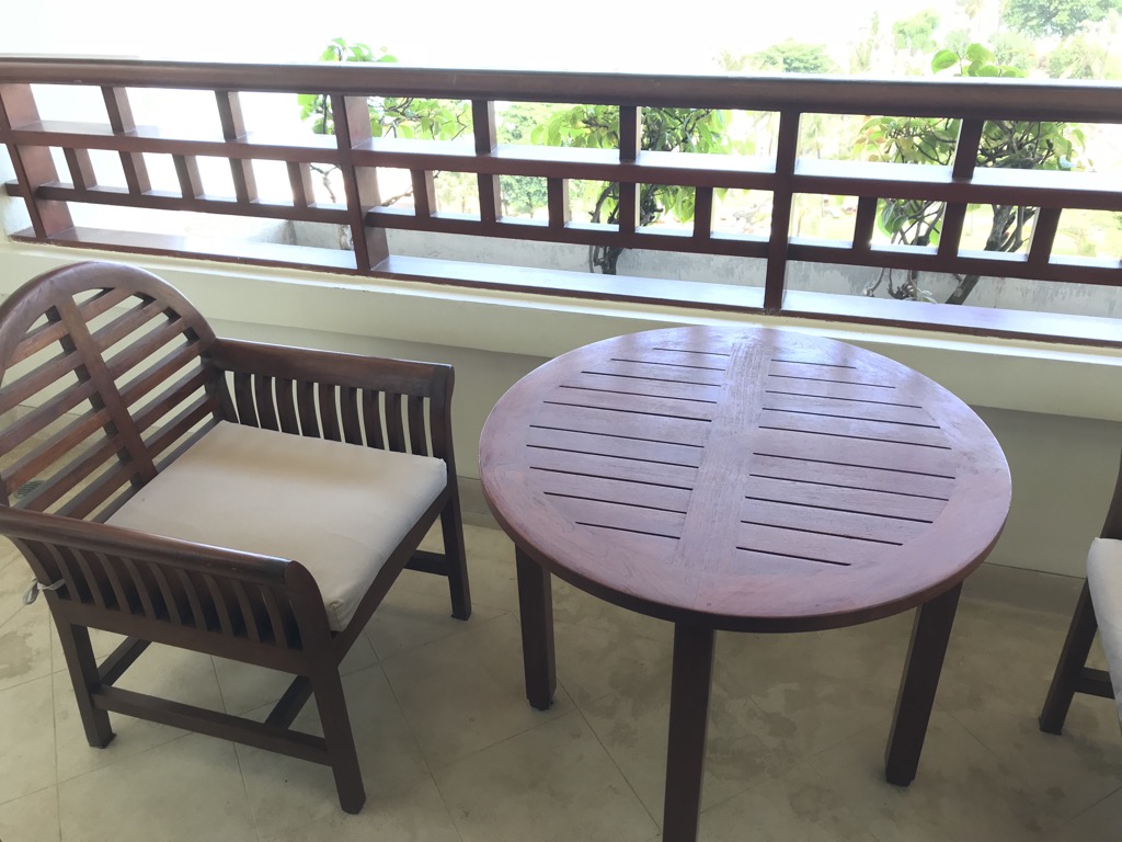 Der Balkon war mit einem Tisch und zwei Stühlen ausgestattet und bot einen tollen Blick über die Hotelanlage auf das Meer.