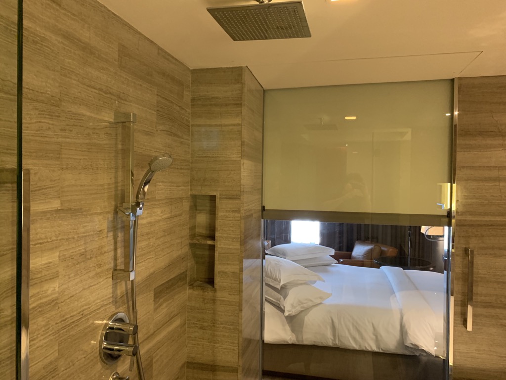 Das Badezimmer war zwar auch nicht besonders groß, allerdings hat es mir persönlich sehr gut gefallen. Die offene Panoramascheibe von der Dusche zum Schlafzimmer ist zwar etwas gewöhnungsbedürftig, aber wenn man wollte, konnte man diese auch mit einem Rollo verblenden.
