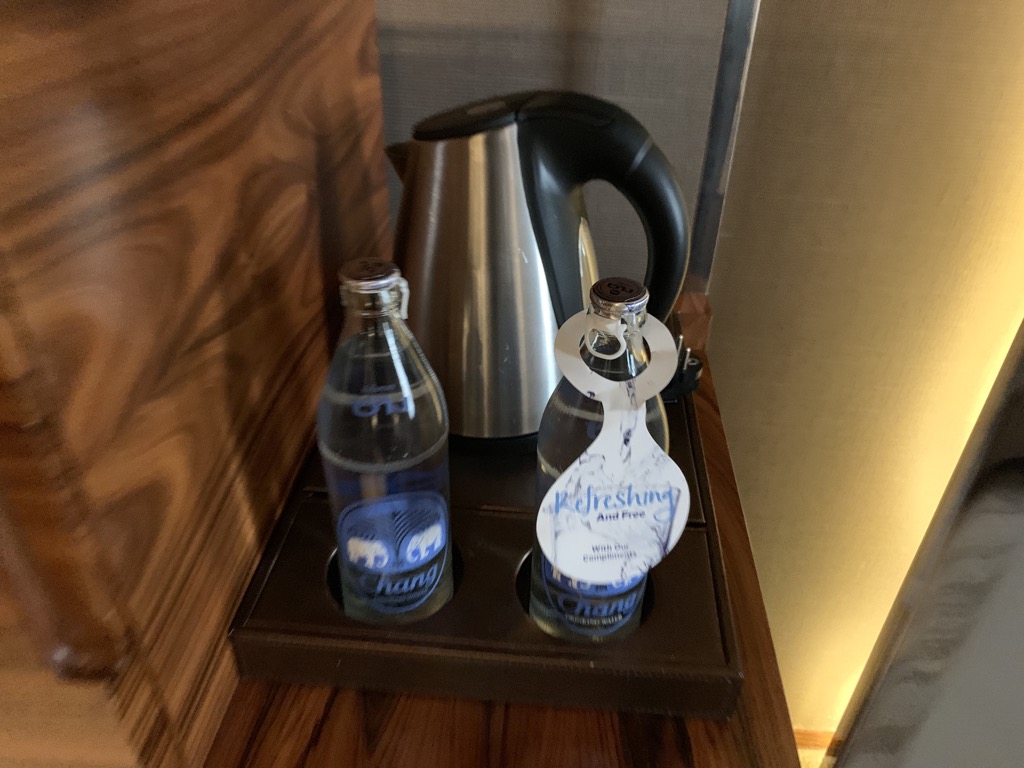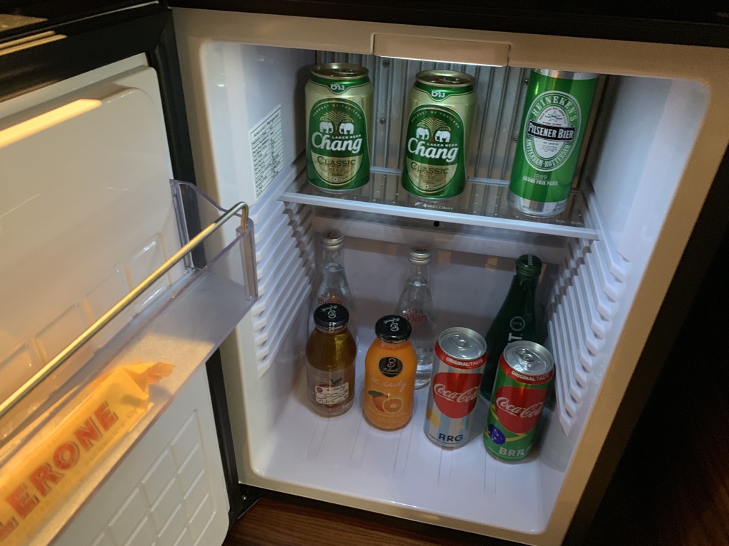Im kleinen Schrank neben dem Eingang, befand sich ein Wasserkocher, zwei Flaschen kostenloses Wasser und die Minibar. Letztere war überschaubar gefüllt, allerdings benutzen diese auch die wenigsten Gäste.
