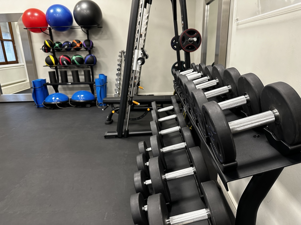 In der ersten Etage ist der Zugang zum Gym, im Fitnessstudio findet man diverse Cardiogeräte und weitere Trainingsmaschinen sowie Hanteln.