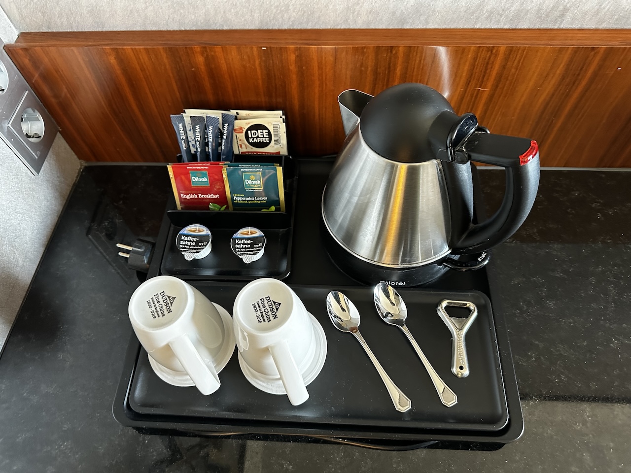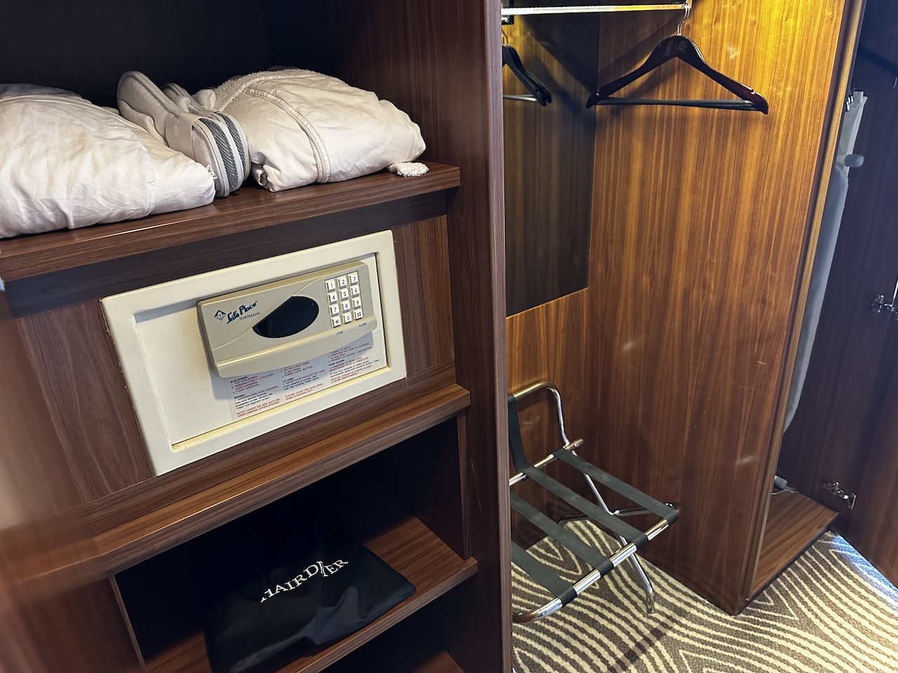 Man findet die üblichen Annehmlichkeiten wie Safe, Bügelbrett, Kühlschrank, Wasserkocher, Föhn…