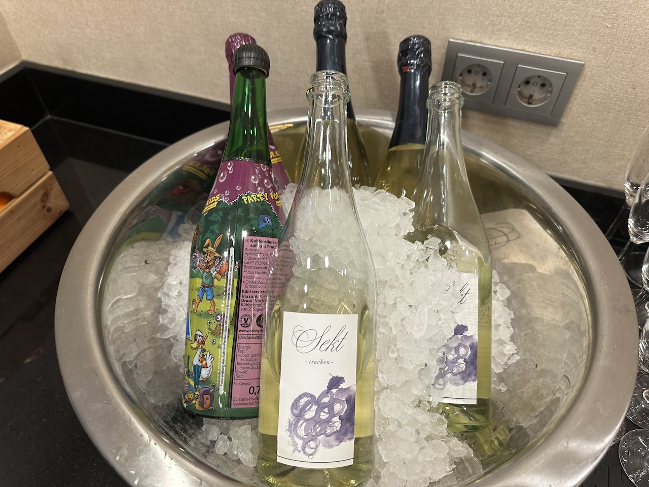 Gäste können sich Wein bzw. Sekt holen, es gibt auch Schnäpse und Liköre. Dank zahlreicher Softdrinks sind diverse Mixgetränke möglich. Mit drei Sorten ist die Bierauswahl etwas spannender als in anderen Lounges