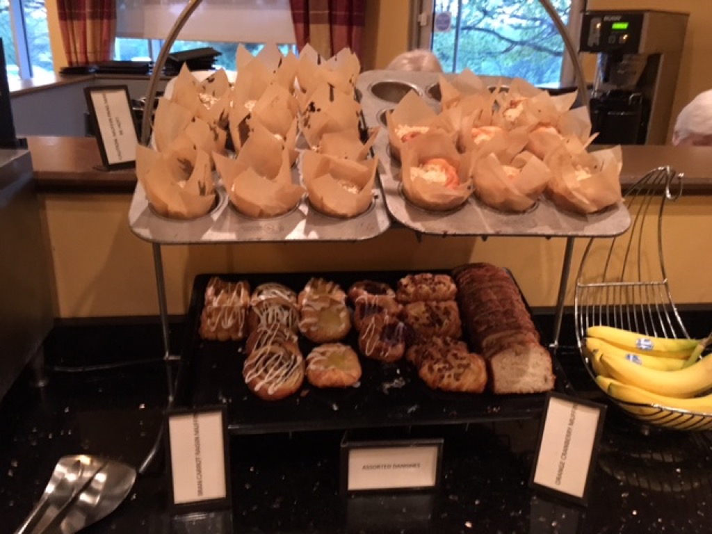 Auf dem Buffet gab es als warme Option die folgenden: Rühreier, Würstchen, Speck, Kartoffeln, Cheese Grits sowie Oatmeal. An kalten Optionen gab es eine Auswahl an Obst, Wurst, Käse und Jogurt. Auch einige Süße Teilchen, Toast und Bagel standen auf dem Buffet bereit.