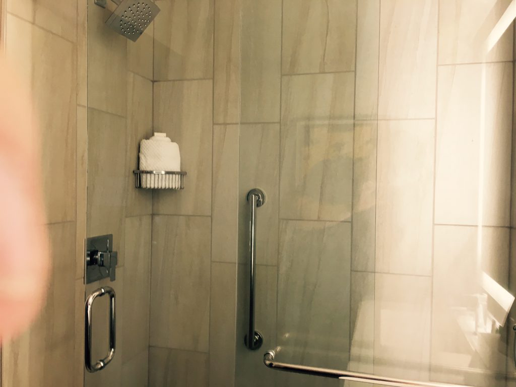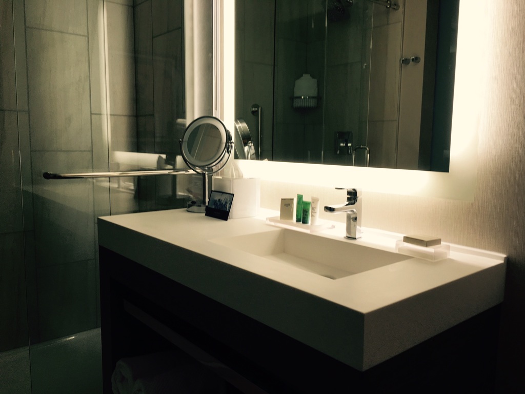 Das Badezimmer war, wie man es von einem neu gebauten Hotel auch erwarten kann, sehr modern und auch sauber. Was mir hier wieder gefallen hat, war die große Dusche anstelle einer Badewanne mit Duschvorhang, wie man es nur zu oft in den USA findet.