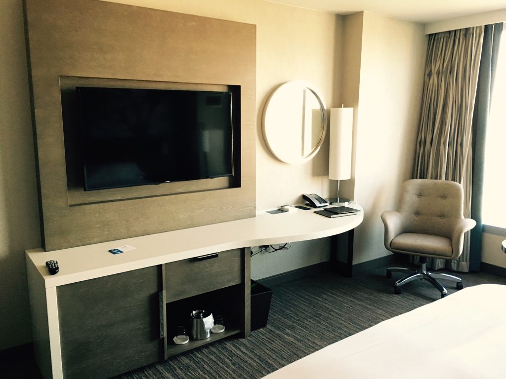 Gegenüber des Bettes befand sich der große Flat Screen, sowie ein Schreibtisch. Besonders am Schreibtisch gab es eine Vielzahl an Steckdosen und USB Anschlüssen, was ich immer sehr angenehm finde.