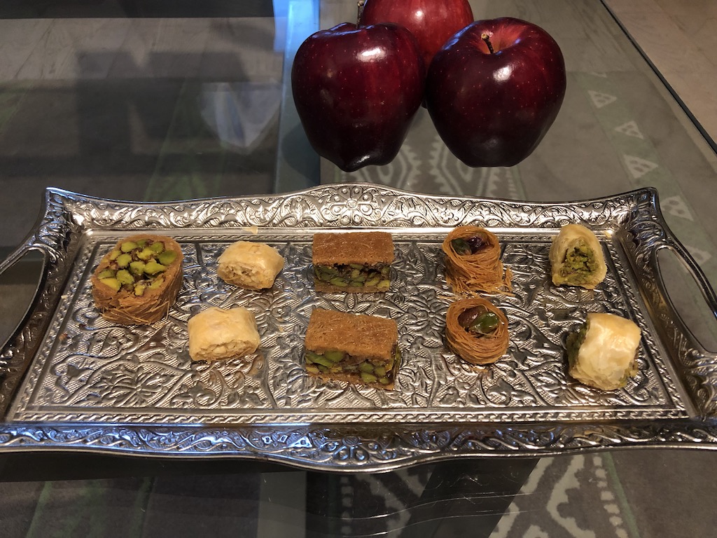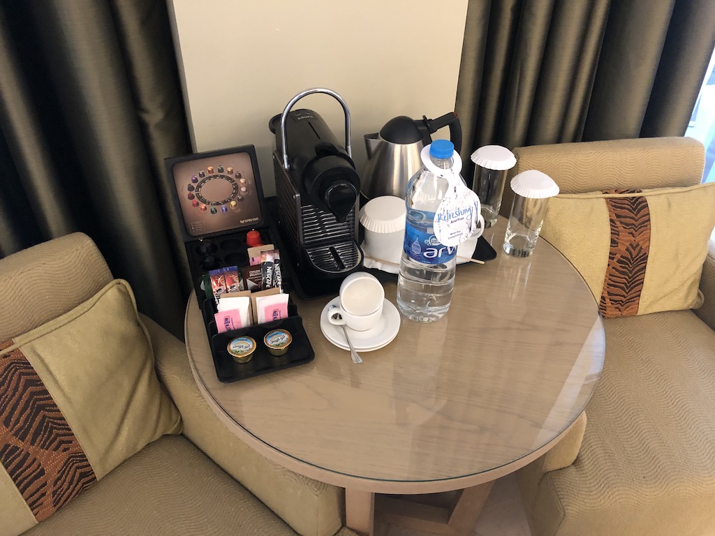 Zur Begrüßung stand auf dem Tisch ein Silbertablett mit Baklava und Äpfeln. Täglich wurden 2 Flaschen mit 1,5 Liter Mineralwasser aufgefüllt. Eine Nespresso-Maschine mit Kapseln und ein Wasserkocher standen zur freien Nutzung. Die Minibar war mit dem üblichen Inhalt zu horrenden Preisen ausgestattet. Ein grosser Balkon mit Meerblick und der Aussicht auf einmalige Sonnenuntergänge gehörte jetzt für fünf Tage uns!