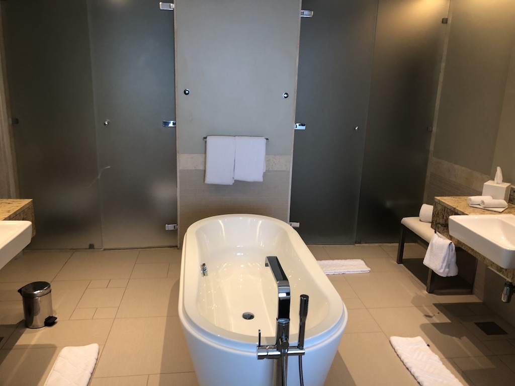 Zum Badezimmer konnte man zwei grosse Schiebetüren öffnen und die Suite wirkte noch größer. Eine freistehende Badewanne befindet sich dort in der Mitte. Ausgestattet war das Bad mit allem erdenklichen was Hotels seinen Gästen als Einwegartikel nur mitgeben kann.