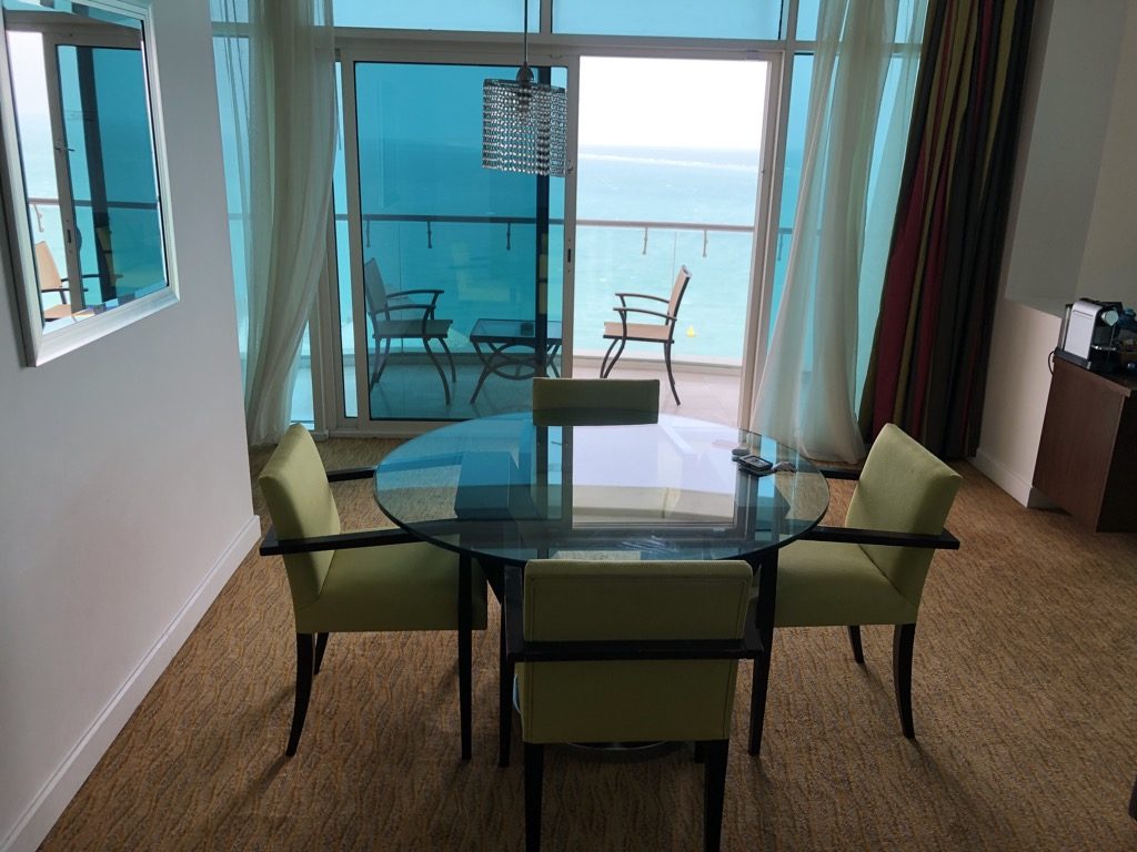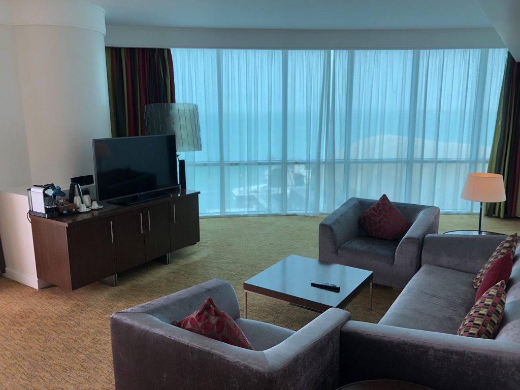 Meine Suite verfügte – wie üblich – über einen Wohn- und einen Schlafbereich. Ersterer bot unter anderem einen kleinen Balkon mit Blick auf die Meeresbucht. Zudem standen natürlich übliche Gadgets wie Nespresso-Maschine, Bügeleisen und Sofagarnitur hier bereit.