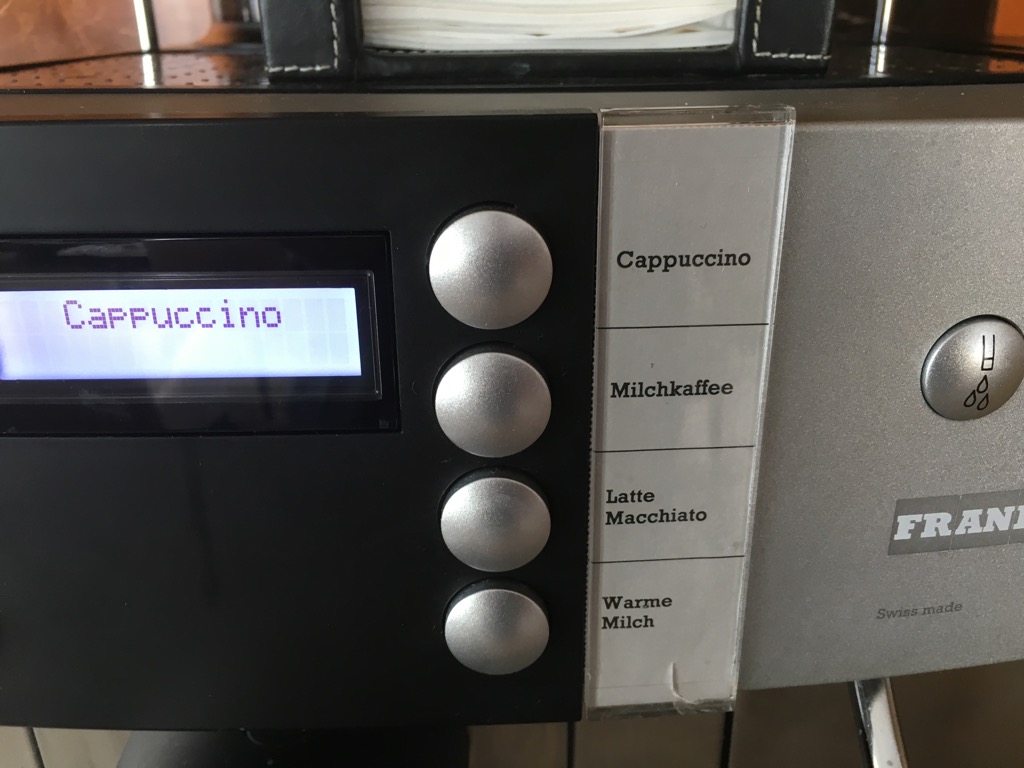 Ein wenig lustig fand ich die Kaffeemaschine neben der Saftbar. Der Franke Vollautomat verfügte über eine deutsche Beschriftung.