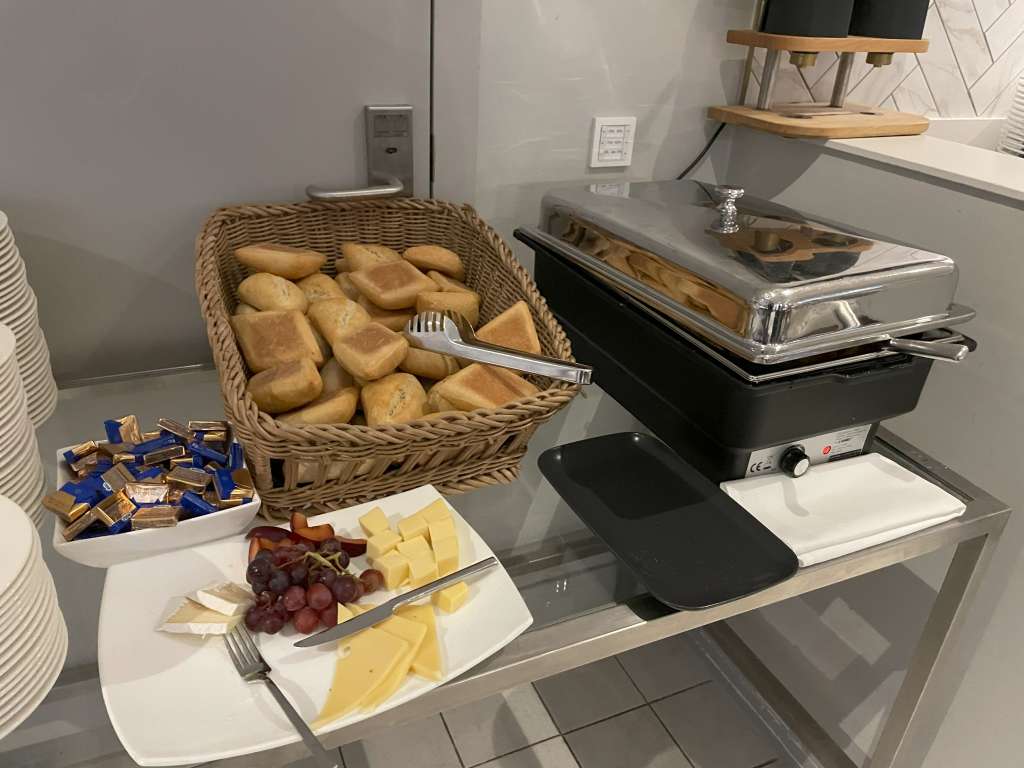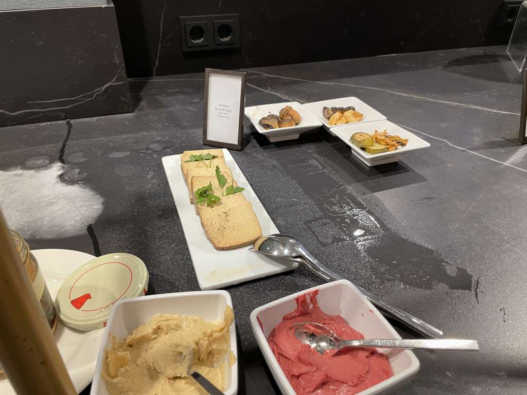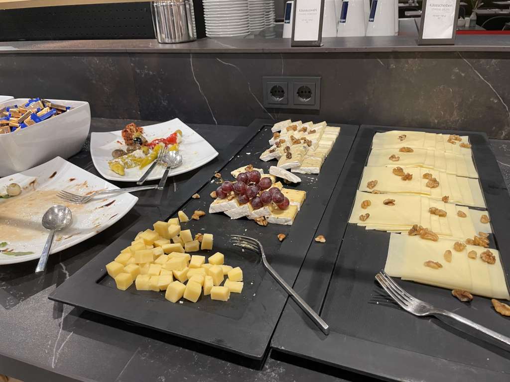 Regelmäßig wird ein vollwertiges warmes Gericht angeboten. In unserem Fall waren dies Putensteaks, Spätzle und Gemüse. Daneben gibt es immer etwas Brot und Vorspeisen auf kleineren Tellern. Zum Dessert könnt Ihr Euch zwischen herzhaft (Weichkäse) und süß (Kuchen oder andere Kleinigkeiten) entscheiden. Leider gab es keine Behälter mit Süßigkeiten mehr. Aber etwas Schokolade brachte die Mitarbeiterin dann doch irgendwann aus der Küche.