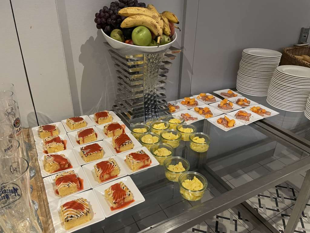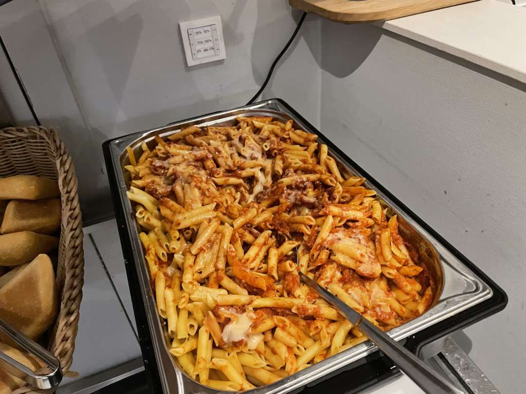 So spiegelte es sich dann auch an dem Abend wider. Als warmes Gericht gab es in einem Chafing Dish Nudeln mit Tomatensoße. Dieses Angebot wurde um Melone mit Schinken, Kartoffelsalat und einer Käseplatte ergänzt. Zum Dessert servierte das Personal wechselnde Kuchen- und Tortenstücke.