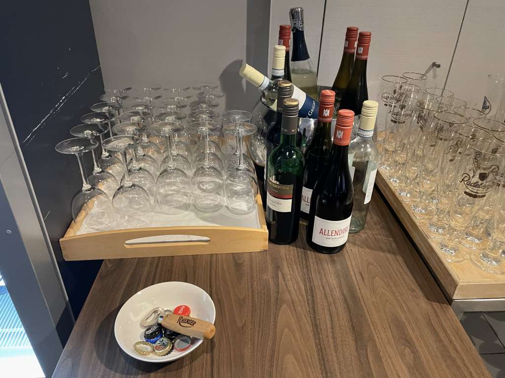 Auch bei der Getränkeauswahl wurde etwas abgespeckt. So gab es neben den klassischen Weiß- und Rotweinen auch immer noch Portwein. Der wurde leider gecancelt. Nicht gecancelt wurden Sekt und Bier. Wobei das Bier nun einfacher zu finden ist. Direkt unter den Weinen klebt nun an der Schranktür ein kleines Etikett mit dem Wort „Bier“. Die Spirituosen wurden mittlerweile an der Wand montiert. Ob das eine Nachwirkung von Covid-19 oder ein Diebstahlschutz ist, ist schwer zu beantworten.