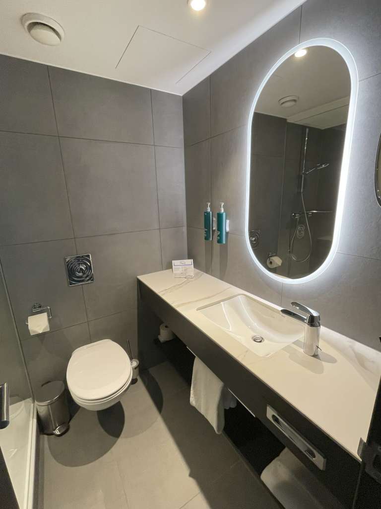 Während andere Hotels beim Thema Badezimmerrenovierung schnell ins Schwitzen kommen und nur das Nötigste tun, wurden im Hilton Düsseldorf die Bäder komplett neu gestaltet. Die dunkelgrauen Fliesen machen mit ihrem großformatigen Schnitt einen deutlich moderneren Eindruck. Der Badewanne ist eine moderne Dusche mit Glasduschwand gefolgt. Diese ist zwar um ein paar Zentimeter höher als der Rest des Badezimmers, aber endlich so, wie man es in einem Hotel dieser Kategorie erwartet.