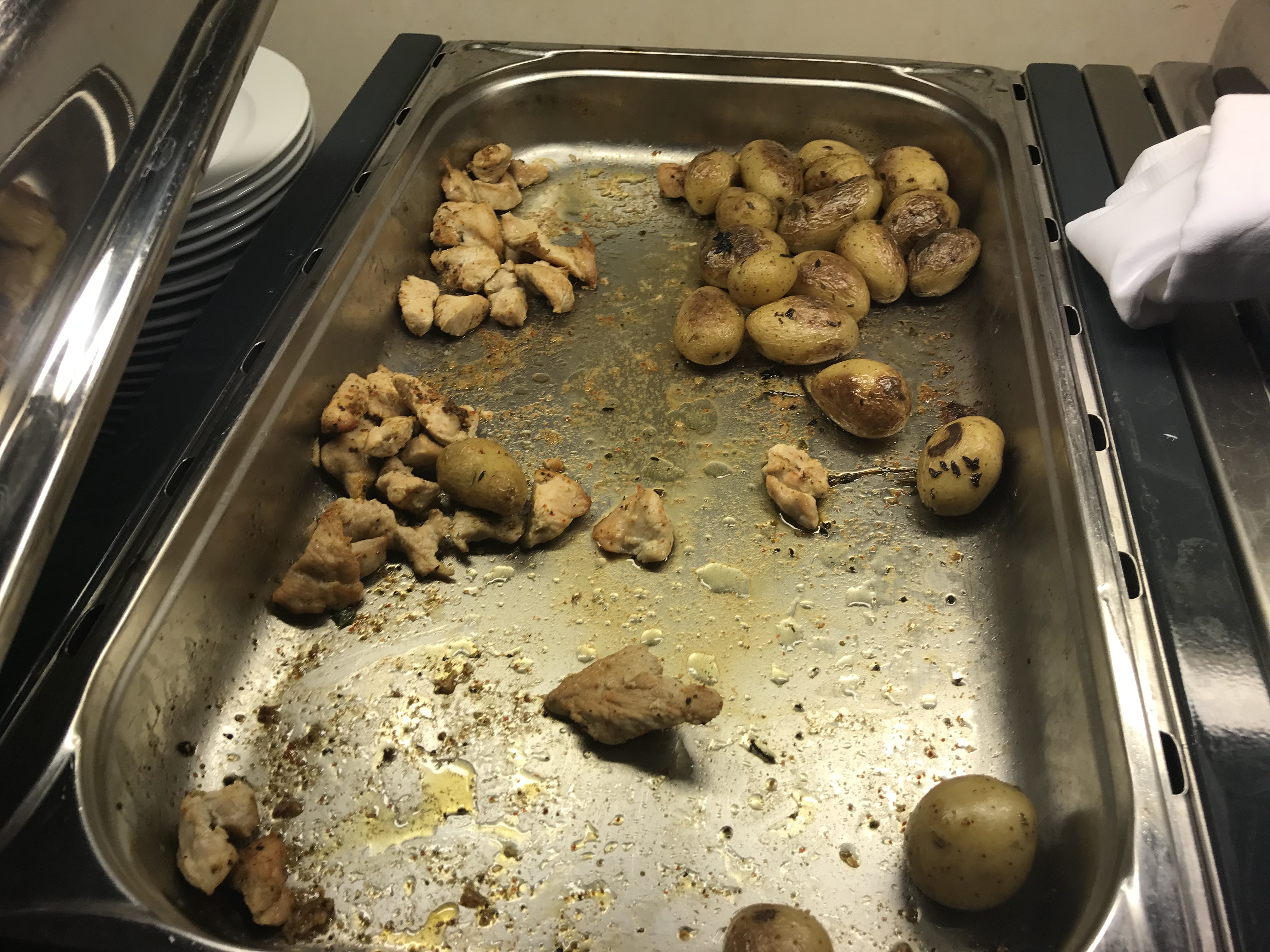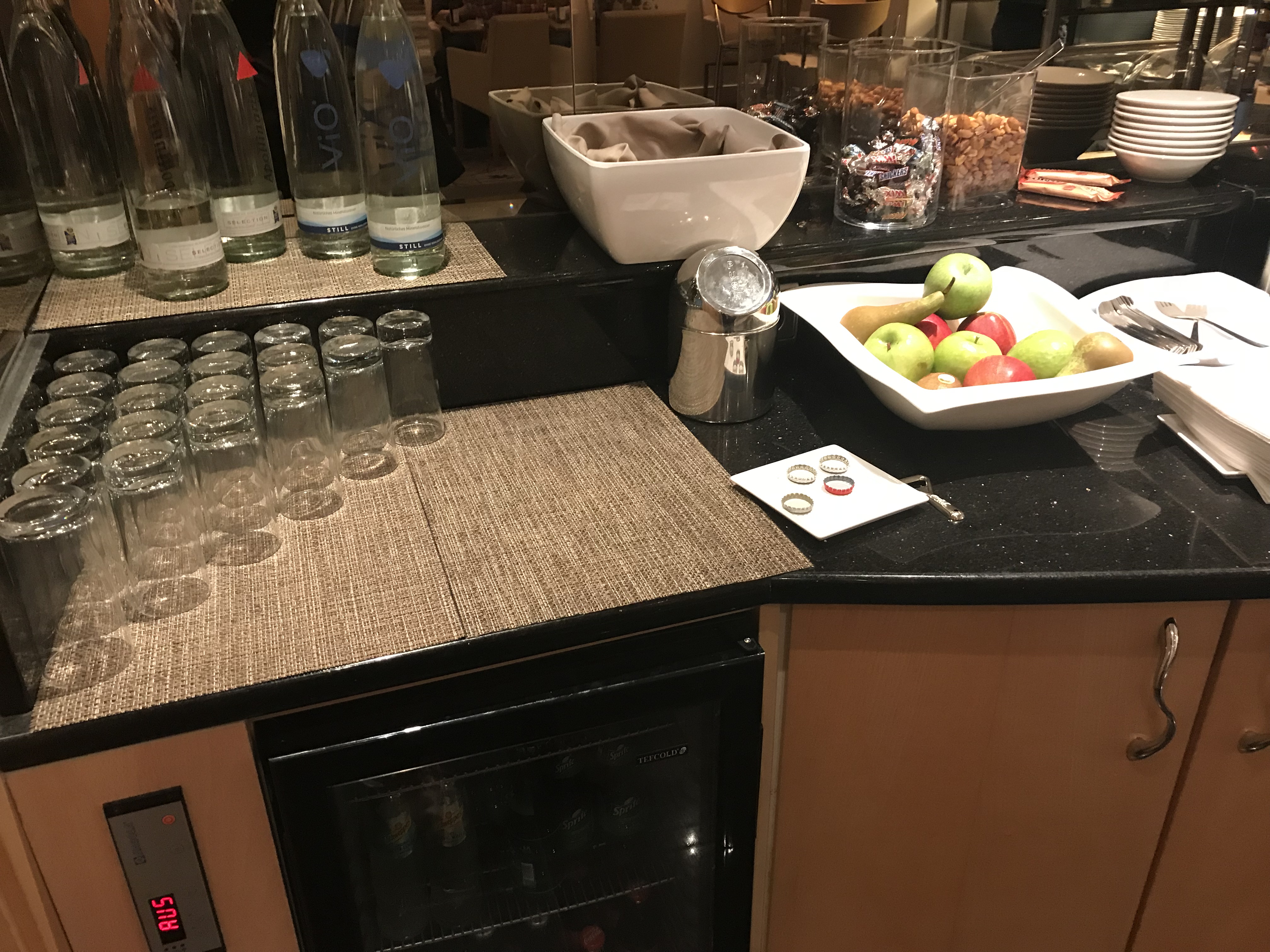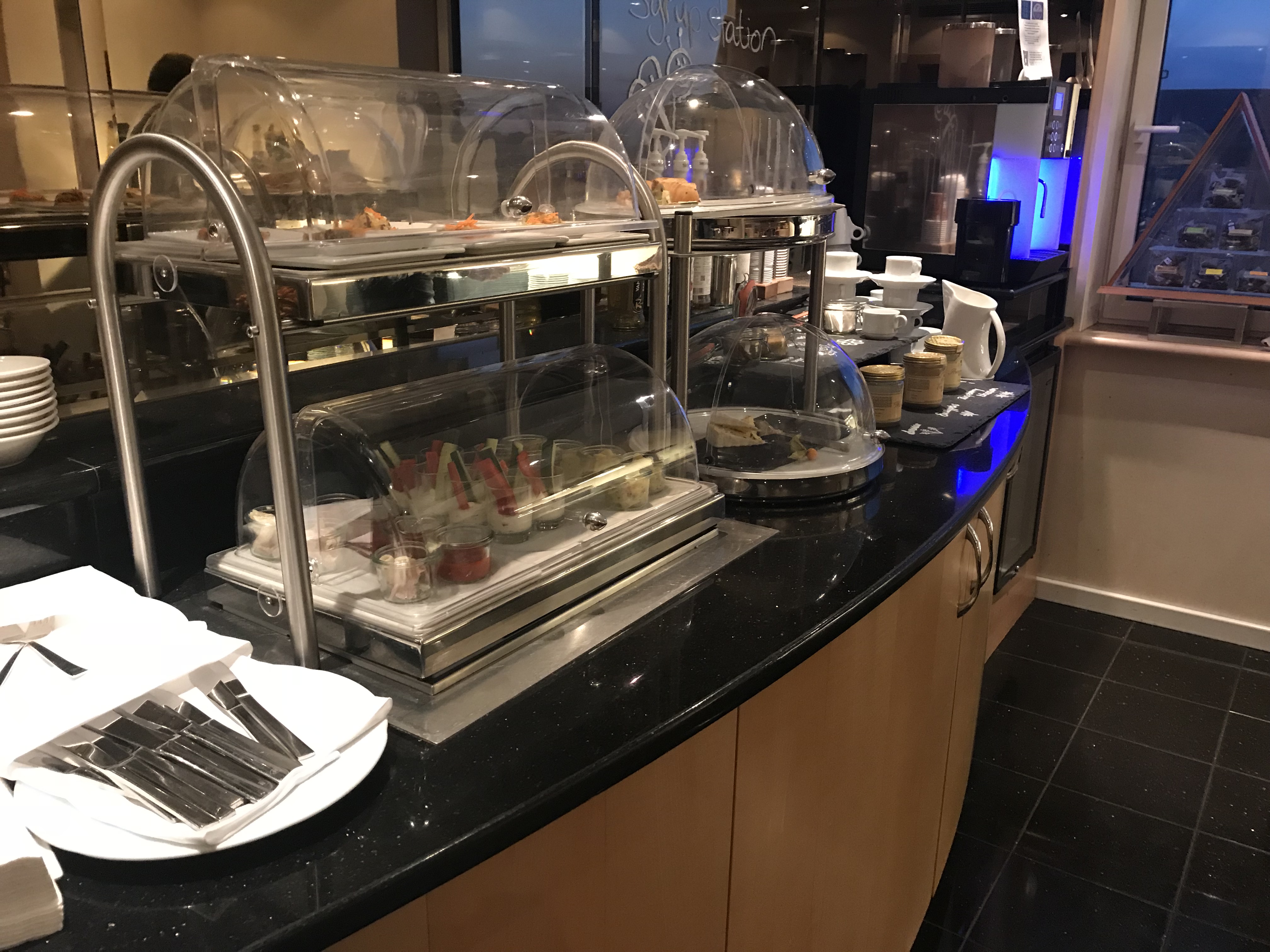 In der Lounge war leider nur ein Mitarbeiter, der vorwiegend damit beschäftigt war das gestürmte Buffet aufzufüllen. Dementsprechend sah der ein oder andere Tisch dann auch aus. Aber wie überall, kann er sich nicht in mehrere Teile teilen und überall sein.