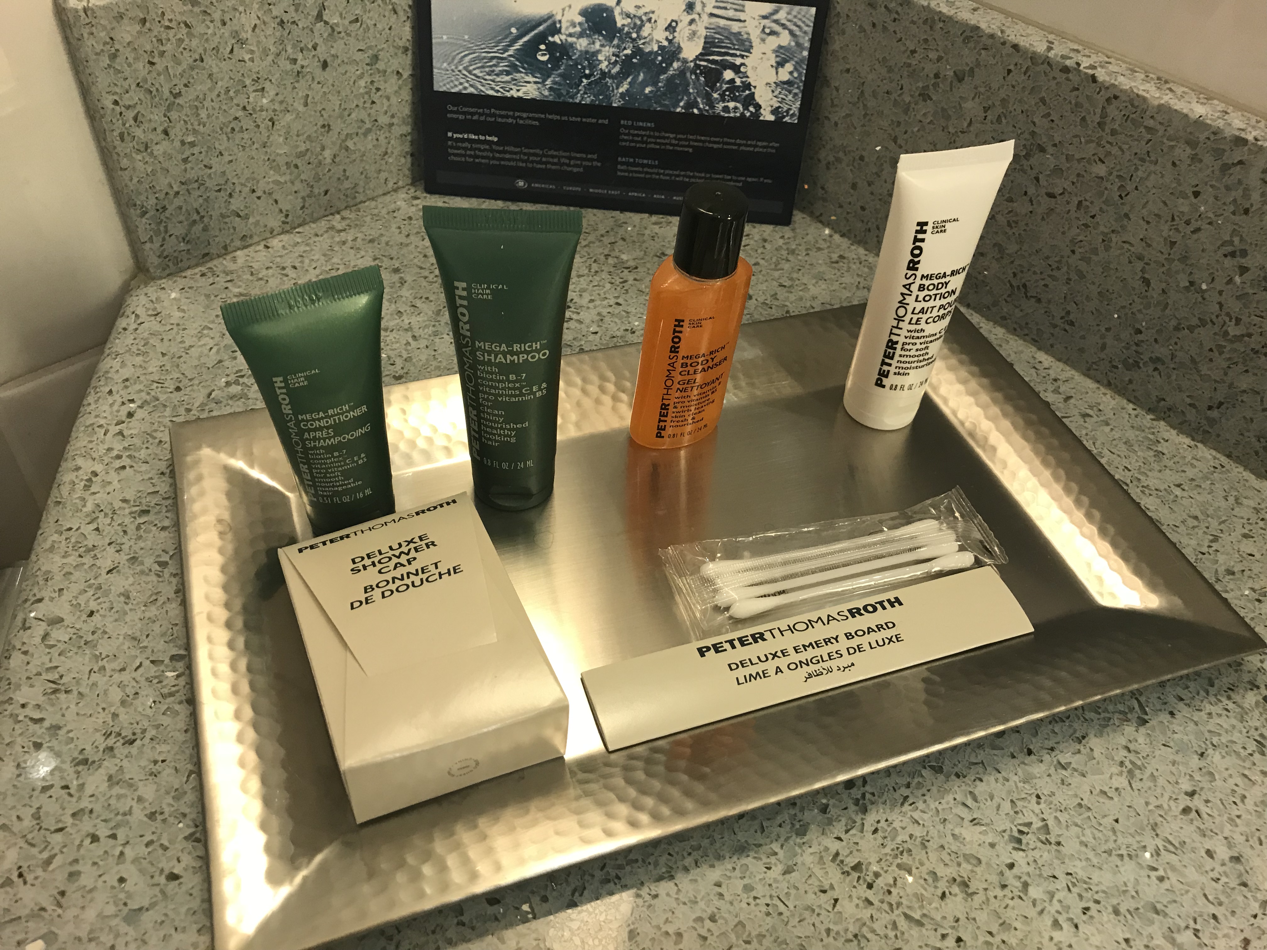 Im Bad befand sich neben einem Waschbecken noch eine Badewanne mit Duschfunktion und die Toilette. Natürlich gab es auch die fürs Hilton üblichen Amenities von Peter Thomas Roth.