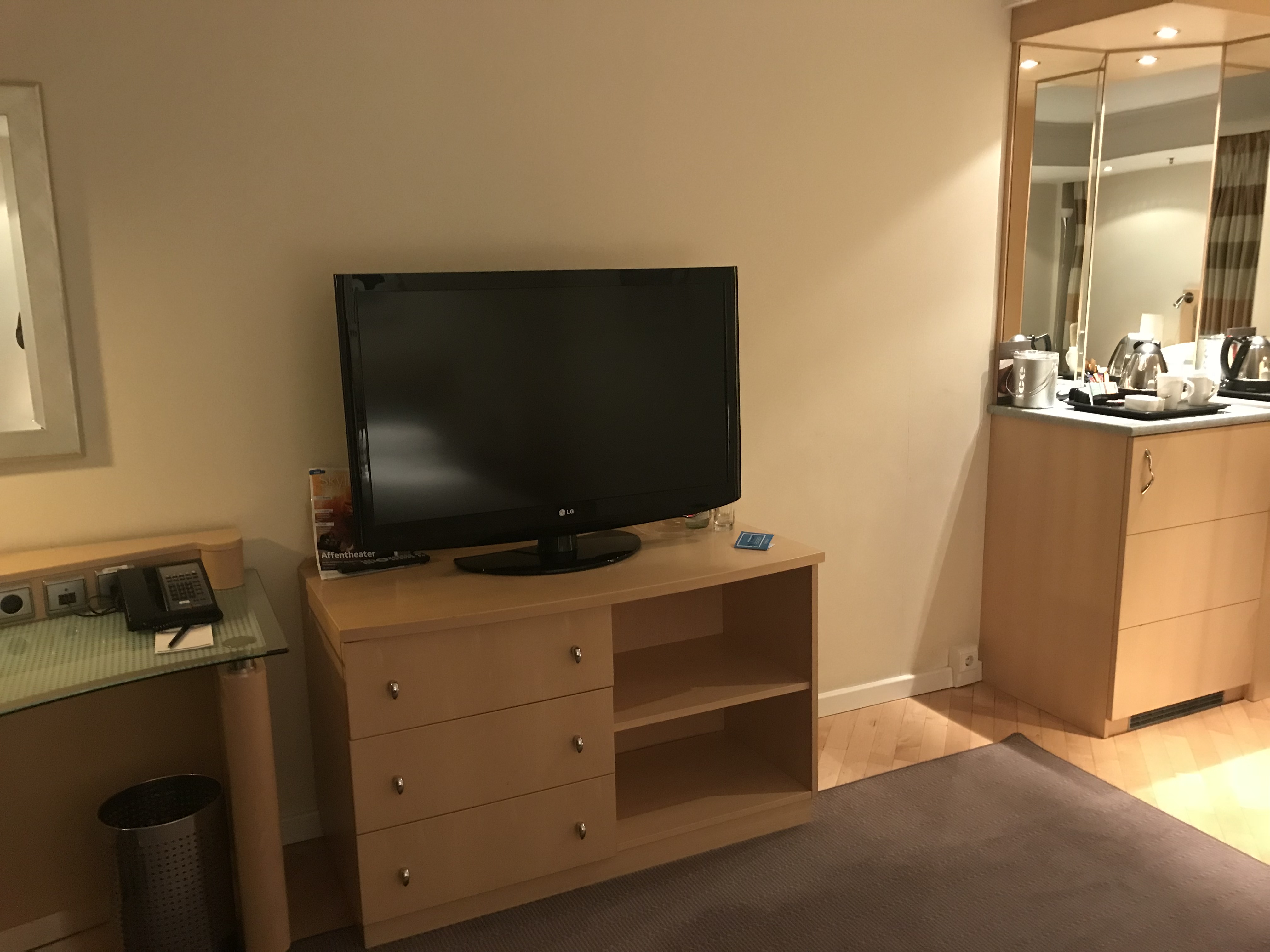 Mein Zimmer befand sich auf dem Executive Floor, relativ am Ende eines Flures. Nach dem Betreten befand sich rechts der Schrank, in dem Safe, Bademäntel und der Fön untergebracht waren. Nach dem Schrank war in einem kleinen Schränkchen die gefüllte Minibar verbaut. Auf der Minibar befand sich die Tee- und Kaffeestation.