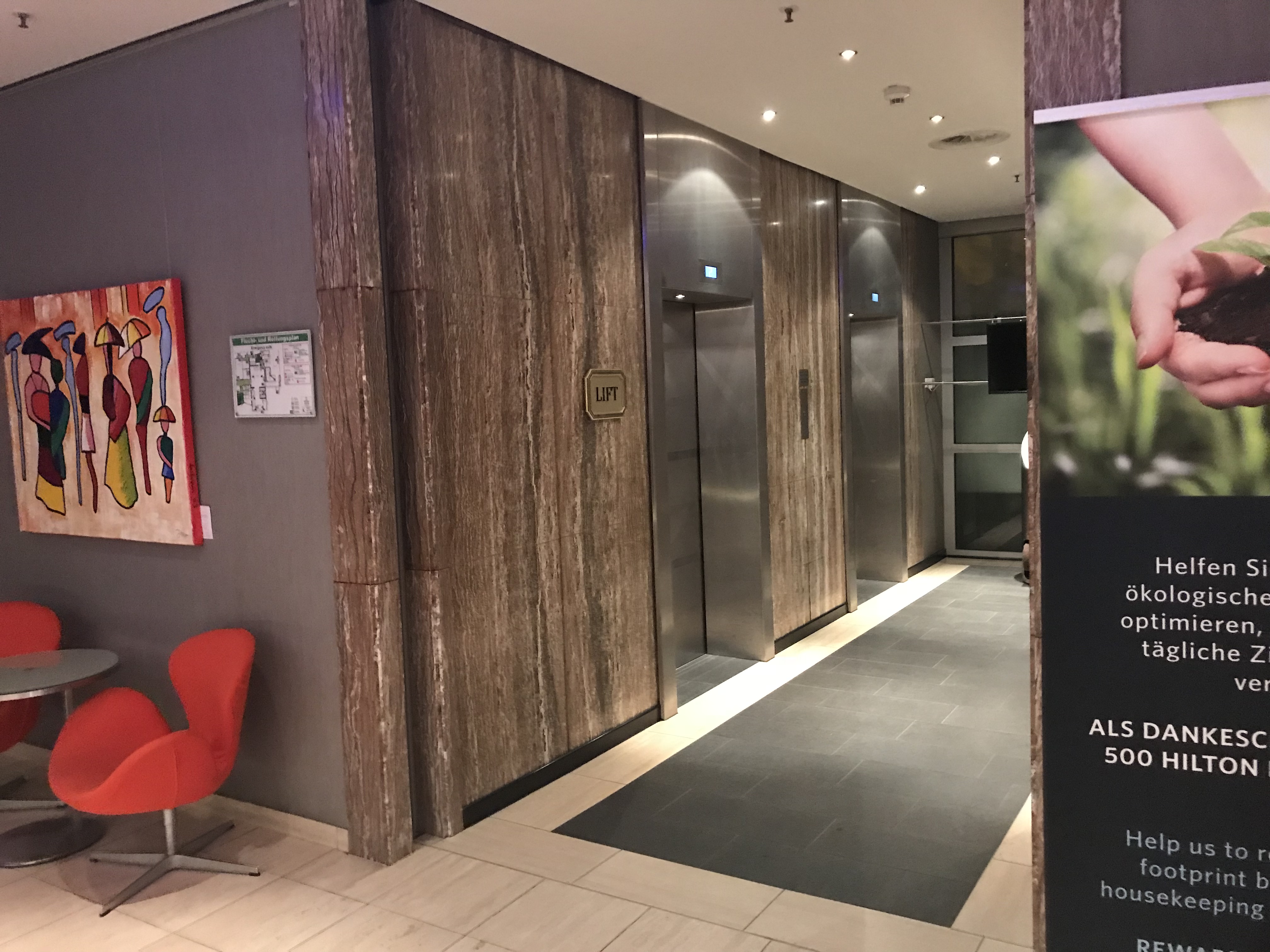 In der Lobby angekommen, wurde ich an der Rezeption sehr freundlich empfangen. Man bedankte sich für die Treue und wies auf die Vorteile des Hilton Diamond Status hin. So bekam ich ein Upgrade auf den Executive Floor und natürlich Zugang zur Lounge, sowieso kostenfreies Wlan und Frühstück. Das Frühstück konnte ich leider nicht mehr genießen, weil mein Flug, wie eingangs erwähnt, schon um 5:50 Uhr startete. Nach einer Unterschrift bekam ich die Zimmerkarte und mir wurden die Wege zum Zimmer und zur Lounge erklärt.