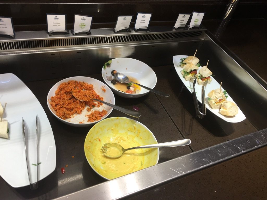 Die Executive Lounge befand sich im 10. Stock und der Zutritt wurde mit der Zimmerkarte kontrolliert. Das Design war sehr Hilton-typisch modern, was mir persönlich sehr gut gefiel. Im vorderen Bereich der Lounge war das Buffet sowie ein recht großer Bistro Bereich mit Sesseln und Tischen.