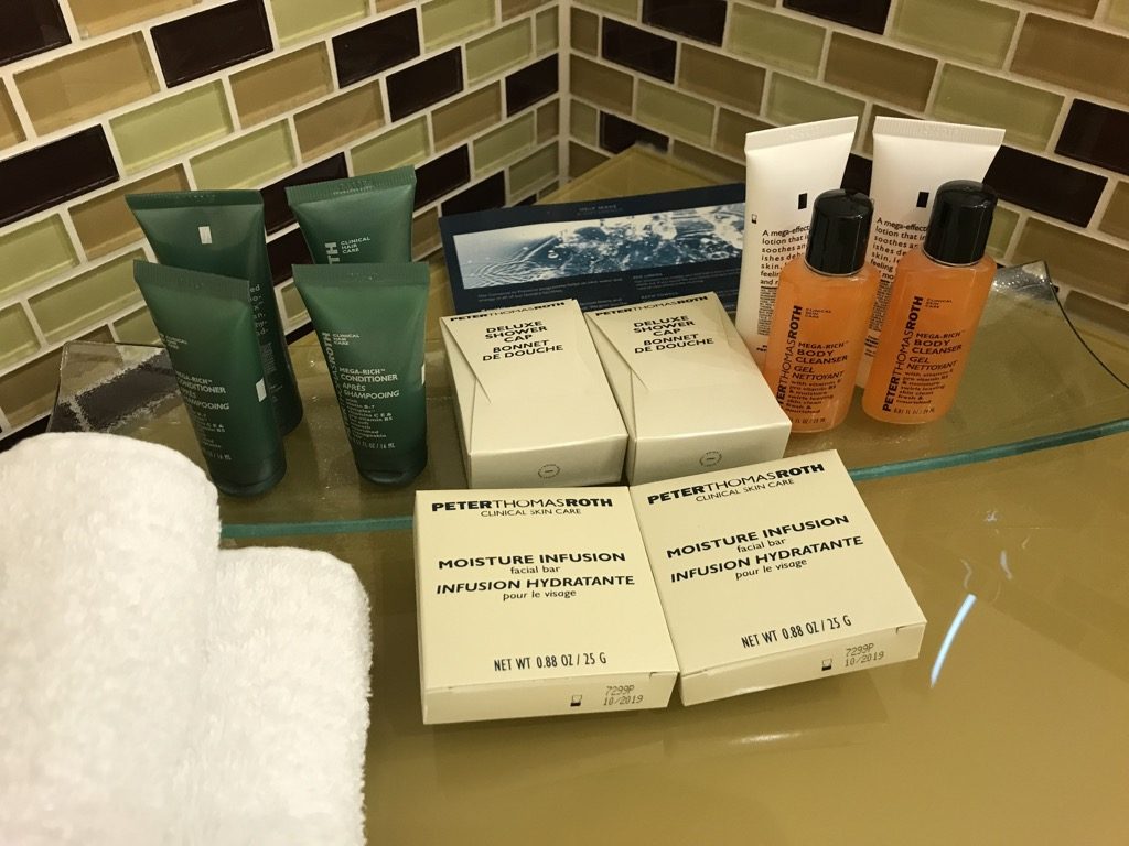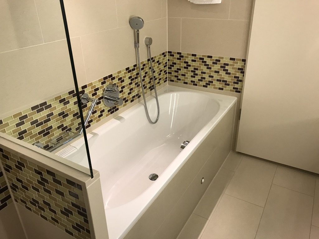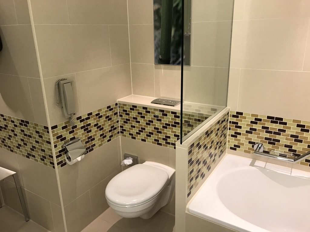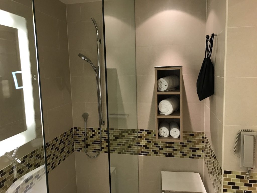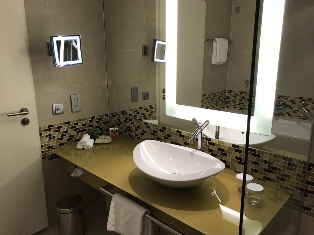 Neben dem begehbaren Kleiderschrank, ebenfalls ans Schlafzimmer angrenzend, befand sich das Badezimmer. Das Badezimmer war, wie der Rest des Zimmers, modern gestaltet und großzügig. Neben den üblichen Badmöbeln war das Bad mit einem Haartrockner und den gewohnten Amenities von Peter Thomas Roth ausgestattet.