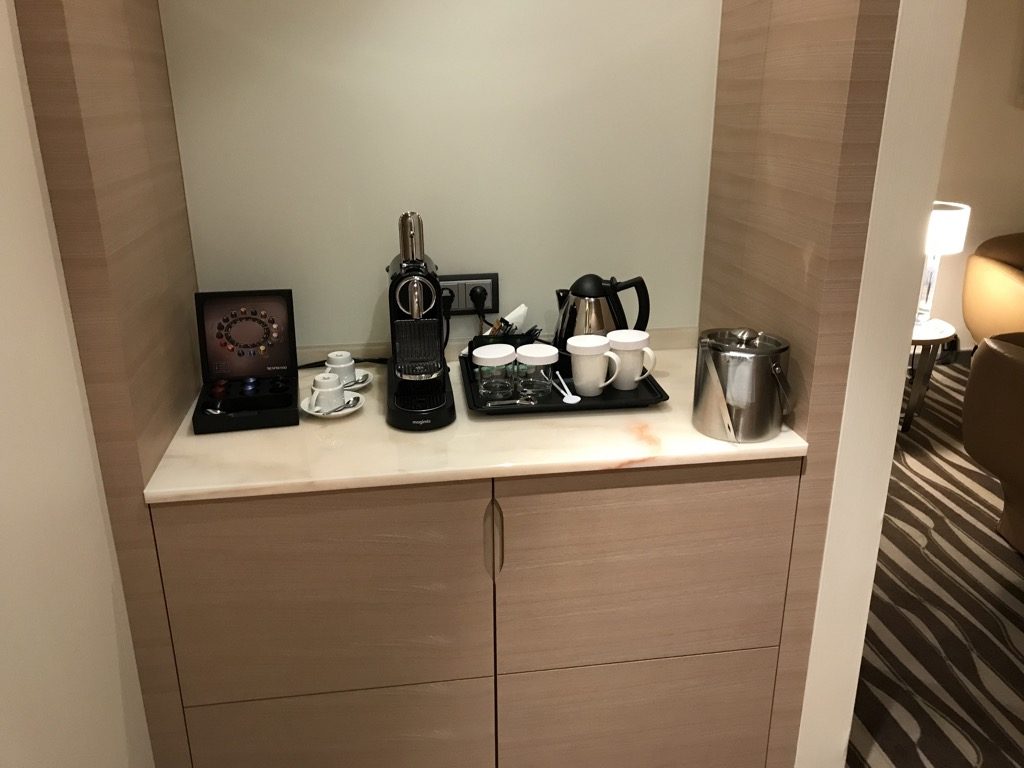 Direkt am Wohnzimmer angeschlossen war eine separate Toilette. Im Wohnzimmer, vor der Toilette, befand sich die vollständige Minibar mit einer Tee- und Kaffeestation.