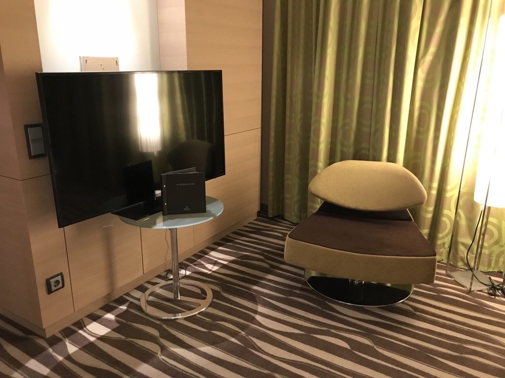 Unsere Suite befand sich im 8. Stockwerk. Nach dem Betreten des Zimmers schaute man zuerst auf das kleine Wohnzimmer inkl. Schreibtisch. Warum man den Schreibtisch, inkl. Schreibtischstuhl, direkt vor einem Fernseher platziert, ist uns ein Rätsel geblieben. Insgesamt war die Einrichtung modern, gut aufeinander abgestimmt und wohnlich.