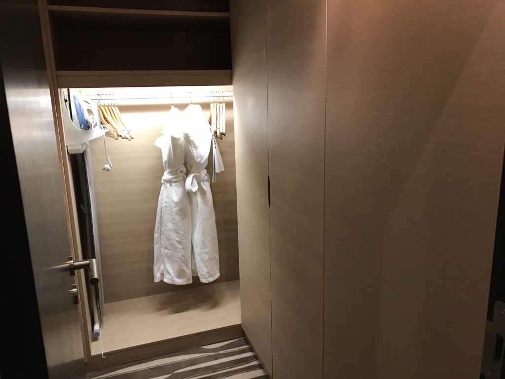 Das Zimmer verfügte über einen begehbaren Kleiderschrank, in dem sich Bademäntel, Bügelbrett, Bügeleisen und Slipper befanden.