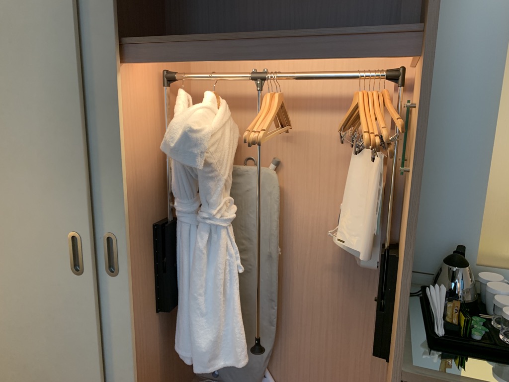 An der Wand neben dem Bett befand sich der Kleiderschrank, welcher für ein Airport Hotel überraschend groß war. In dem Kleiderschrank befand sich neben den Bademänteln auch das Bügelbrett und den Save.