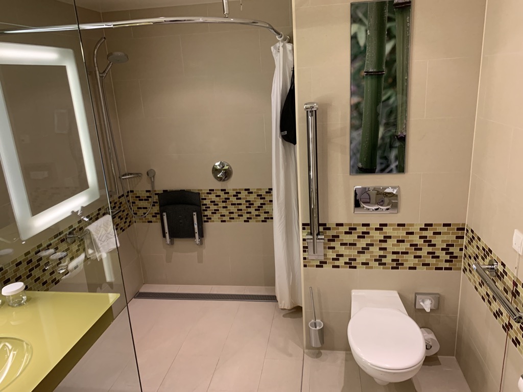 Im Badezimmer hat man dann sehr deutlich gesehen, dass es ein behindertengerechtes Zimmer war, bzw. hier ist es mir zum ersten mal wirklich aufgefallen. Anstelle der Badewanne war hier eine riesige Dusche verbaut, welche man auch mit einem Rollstuhl befahren könnte und es gab an einigen Stellen entsprechende Haltegriffe.
