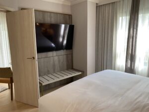 Insgesamt war die Suite in einem super Zustand und schön gestaltet, was aber auch nicht anders zu erwarten ist, denn das Hotel hat erst einen Monat vorher frisch renoviert eröffnet. Das Zimmer hat definitiv Potential, aber es ist unglaublich eng geschnitten. Selbst mit zusammengeklapptem Kinderwagen war nicht mehr Platz als „Laufwege“.