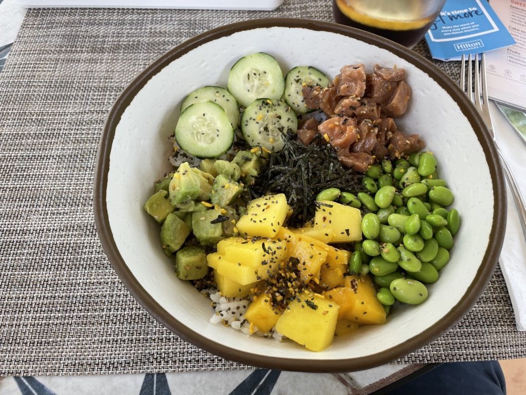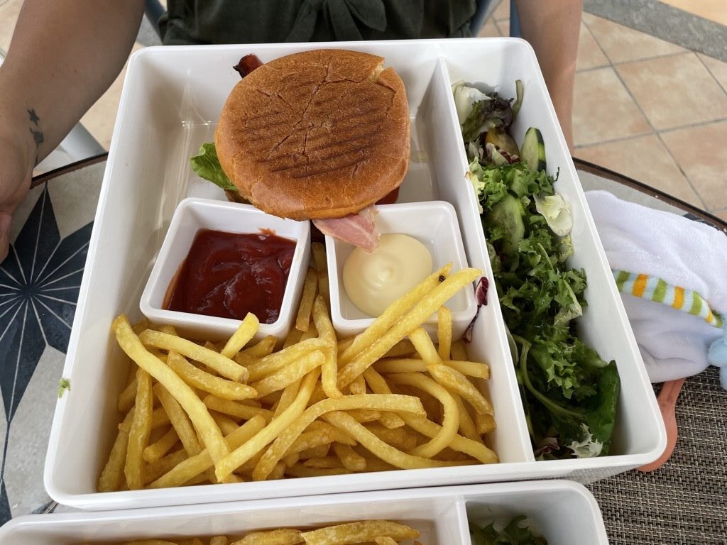 Wir haben, weil das Restaurant leider erst zur Schlafenszeit der Kinder öffnet, ab und zu in der Pool Bar zu Abend gegessen. Das Menü reichte von Burger über Bowl bis hin zu Salaten und Pizza. Alles bestellte wird in einer Art Bento Boxen gerichtet. Ich bin wirklich nicht extrem wählerisch beim Essen, aber leider waren meine bestellten Gerichte eher mittelmäßig, kalt oder geschmacklos. Auch Christoph war bis auf die Bowl, die er sehr lecker fand, eher negativ überrascht. Der Service in der Pool Bar war grundsätzlich nett, wenn man jemand kam. Obwohl immer mehrere Kellner zugegen waren, die wenige Tische betreuten, mussten wir teilweise 20 Minuten warten, bis ein erster Kontakt entstand.