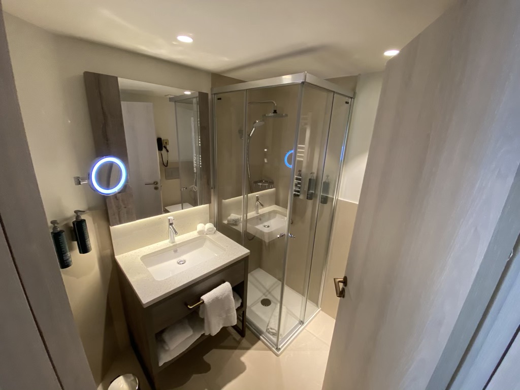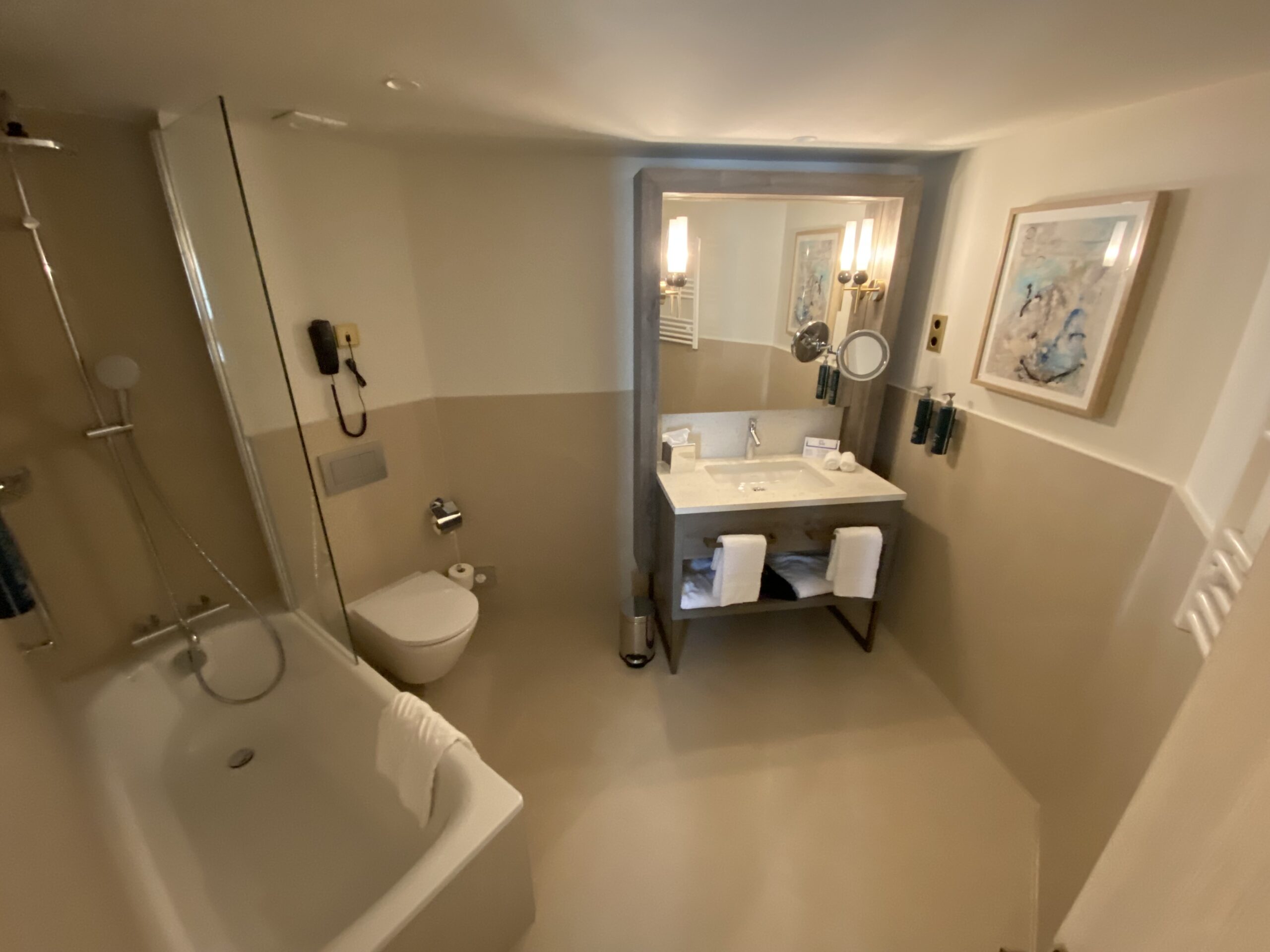 Rechter Hand des Wohnzimmers befand sich ein richtiges Schlafzimmer mit Doppelbett, Schrank, Kofferablage und TV. Auch hier war alles etwas eng und wenig großzügig. Angeschlossen an das Schlafzimmer konnten wir ein weiteres Bad unser Eigen nennen – diesmal mit einer Badewanne. Wesentlich größer als das andere Badezimmer. Beide Badezimmer waren mit Spendern ausgestattet – ansonsten lagen keine Amenities bereit, diese hätte man aber sicher auf Nachfrage bekommen.