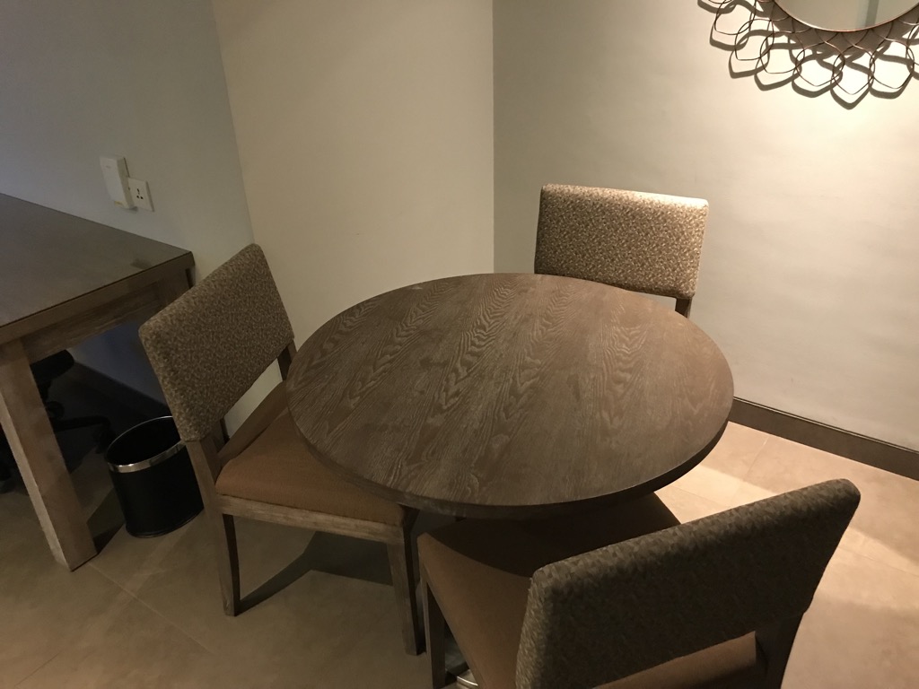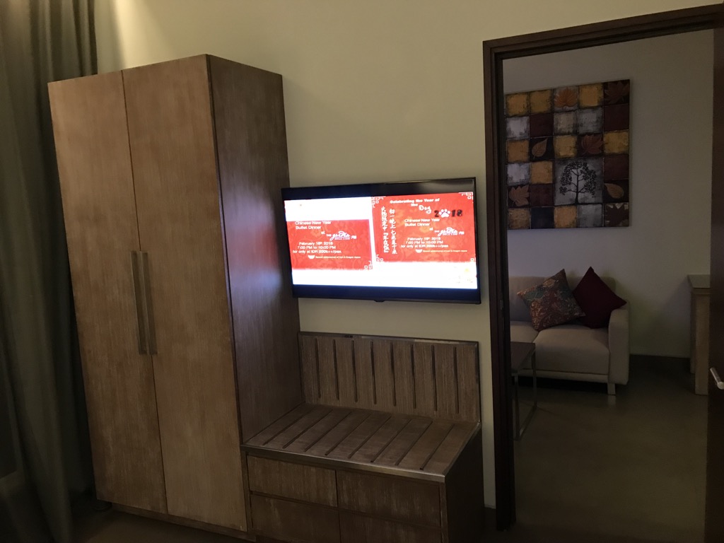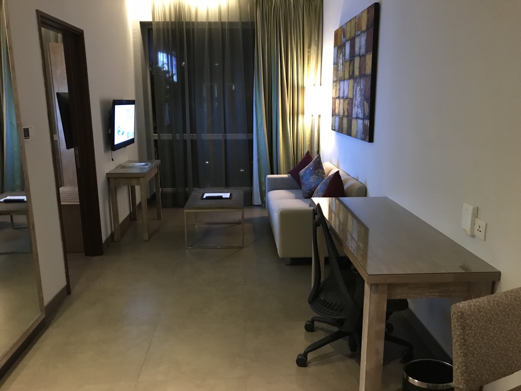 Die Suite im Hilton Garden Inn Bali Airport hatte eine gute Größe und war angenehm klinmatisiert. Nach Betreten des Zimmers stand man im Wohnbereich, der aus einem Tisch mit Stühlen, einer Tee- und Kaffeebar und einer Couch mit gegenüberliegendem TV bestand.