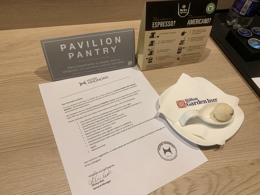 Neben der Tür befand sich ein Kühlschrank und darüber auch eine Espresso Maschine und Tee. Schön fand ich das Begrüßungsschreiben vom Hotel und auch das kleine Amenity in Form von einer Praline. Gerade in Hilton Garden Inns ist so etwas eher selten und hier ist es ganz klar die Geste, die zählt