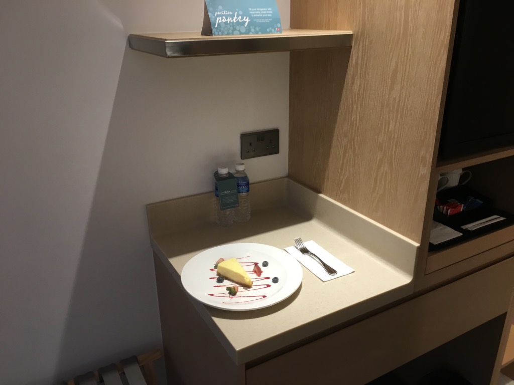 Neben dem Fernseher befand sich noch ein leerer Kühlschrank, der Kleiderschrank inkl. Safe und eine Kaffee- und Teestation. Auf der Ablage stand bereits ein Stück Kuchen für uns bereit, was entweder dem Hilton Honors Diamond Status geschuldet war oder den Flitterwochen.