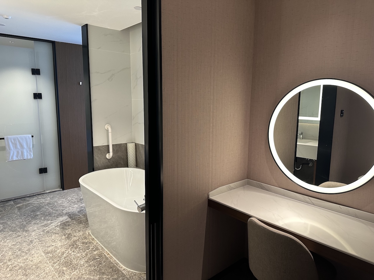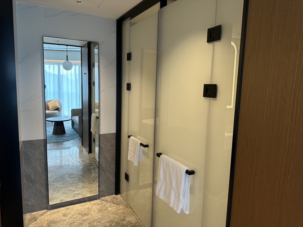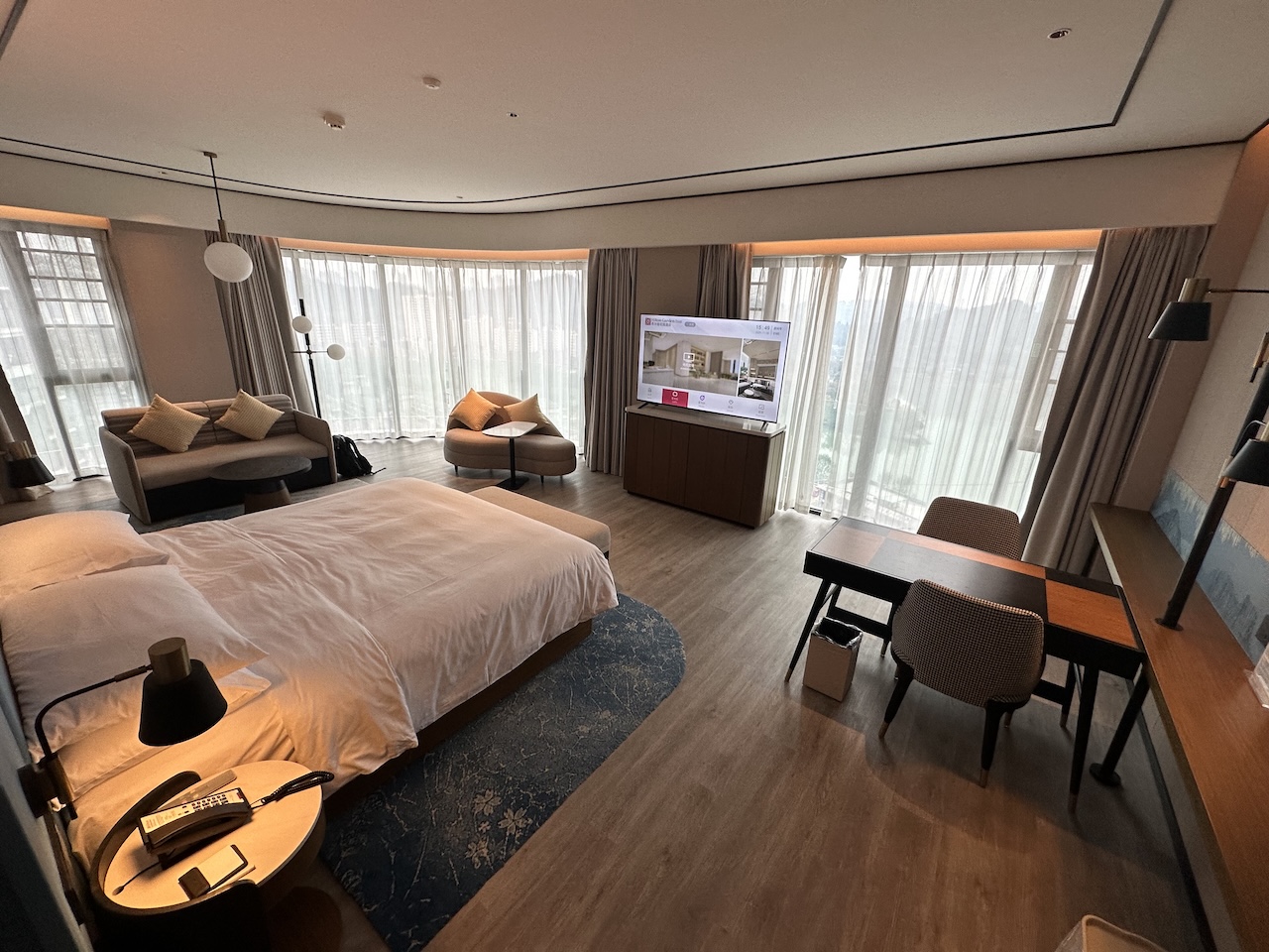Das riesige Zimmer war an einer Ecke des Hotels und durch die Panoramafenster sehr hell. Auch die Einrichtung war modern und in helleren Tönen gehalten.