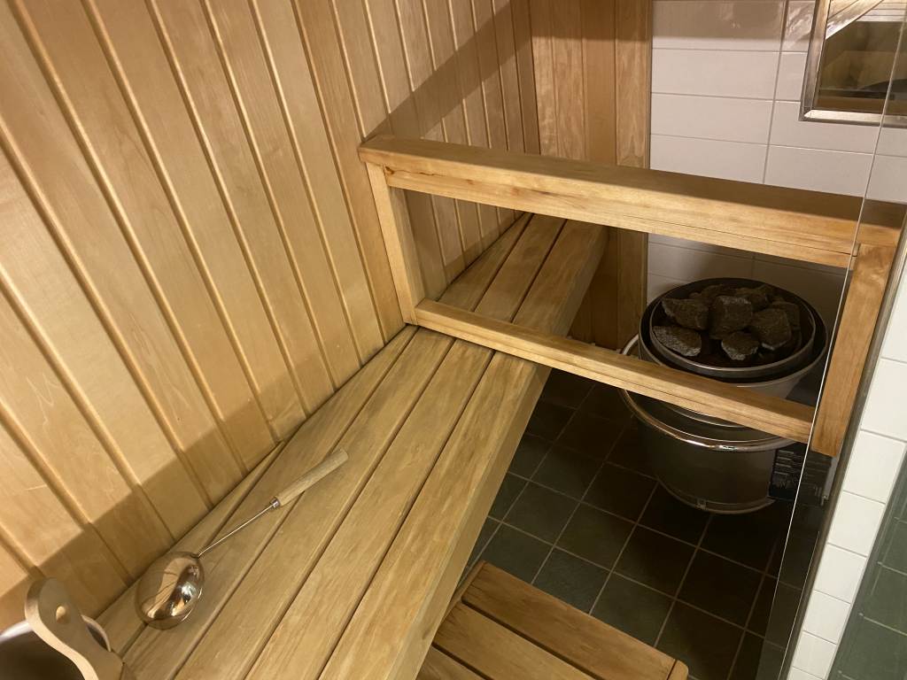 Mein persönliches Highlight 2 im Bad: Natürlich die private Sauna. Die ist zwar von der Größe her nur ein kleines Separee, betretbar durch eine Glastür, bietet aber zwei Personen (und notfalls auch zwei kleinen Kindern) platz. Wobei nur eine Person auf der oberen Ebene sitzen und in den Genuss der vollen Hitze (90 Grad Plus) kommen kann). Geregelt wird die Sauna über eine Schaltfläche im Bad. Nach einer gewissen Zeit schaltet sich der Ofen automatisch aus, so dass man sich hier keine Sorgen machen muss. Für einen Aufguss steht Eimer und Kelle bereit und aus der Sauna kann man durch ein Fenster auch einen Blick in das Zimmer werfen (so konnten wir auch die schlafenden Kinder im Blick behalten).