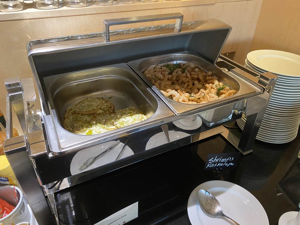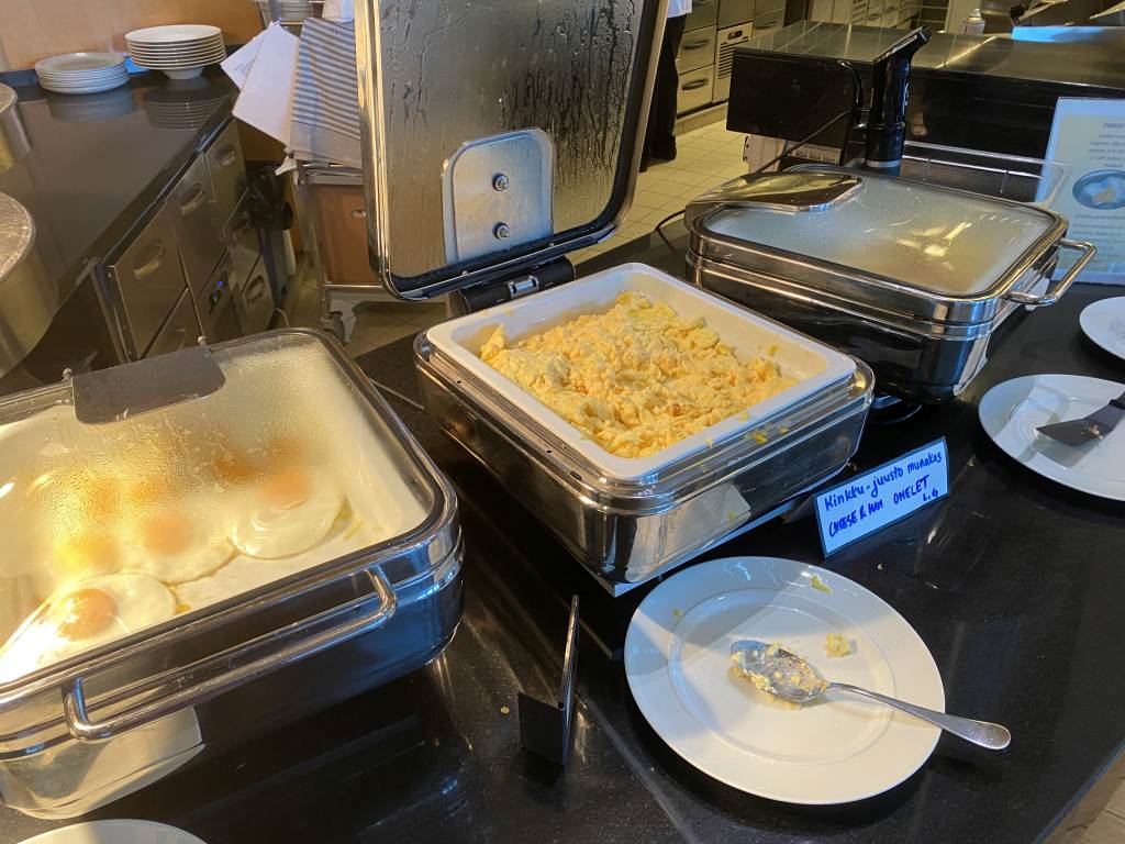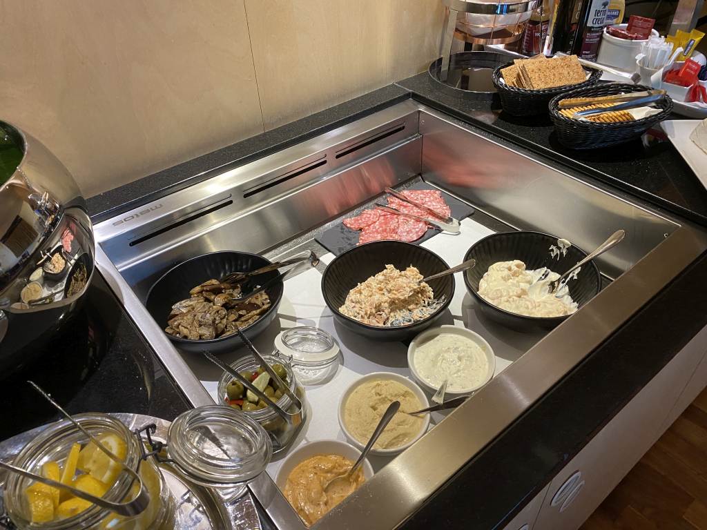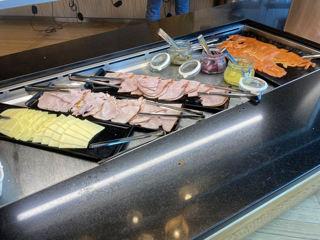 An einer Station werden Eierspeisen, wie gekochte Eier und Rührei sowie wechselnde Variationen, angeboten. Dazu werden auf zwei Inseln Wurst-, Fisch- und Käseaufschnitt, sowie frische Salate und Smoothies angeboten. Eine lange Theke bietet warme Speisen, wie gebackene Bohnen, Rentier-Fleischbällchen, Röstis, Würstchen und co. Ergänzt wird das Büffet noch um eine Station mit Frühstücks-Cerealien und Backwaren. Wobei sich die Auswahl an Backwaren auf süßes Plundergebäck, Toast, Croissants, eine Sorte Brötchen und Brot beschränkte. Das war eher überschaubar.