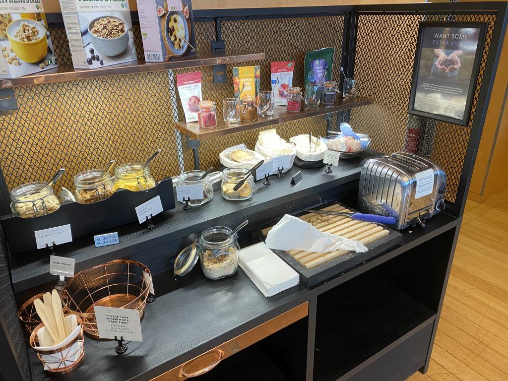 Die Lounge erinnerte mich echt sehr and Hilton Düsseldorf. Mit dem Essbereich, der langen Theke und dem Serviceraum am Ende davon. Allerdings mit dem Unterschied, dass das Essen wieder aufgefüllt wurde.