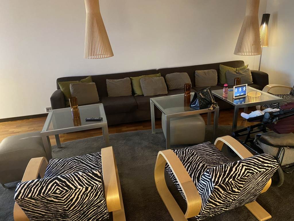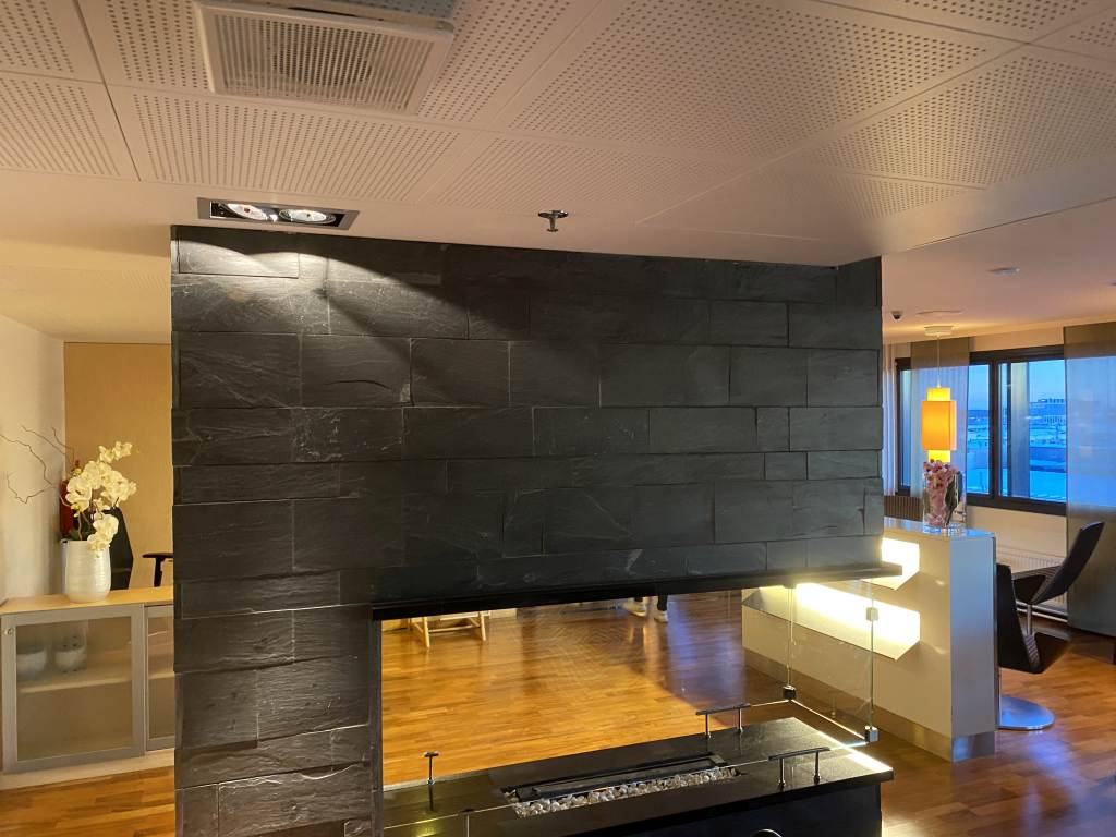 Die Lounge ist nicht wirklich groß. Und so gibt es auch nur eine überschaubare Anzahl an Sitzgelegenheiten, die aus einigen Esstischen entlang der Fensterfront und einer Wohnlandschaft mit einem Sofa, mehreren Sesseln und drei Tischen besteht. Als Raumteiler dient dabei ein Kamin.